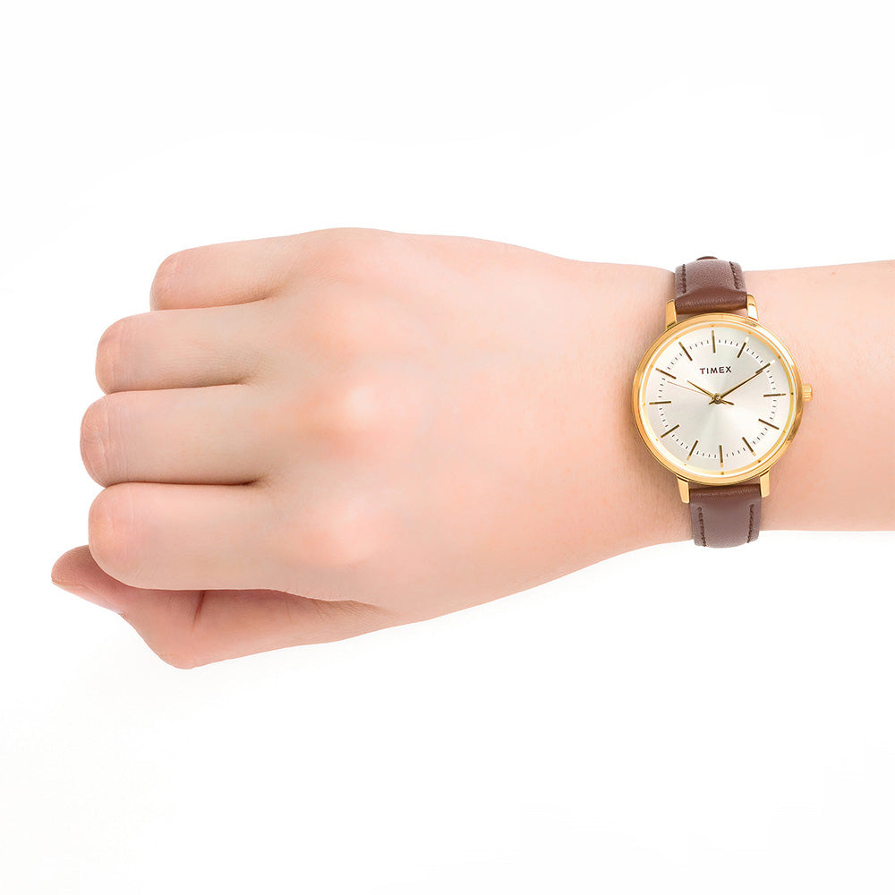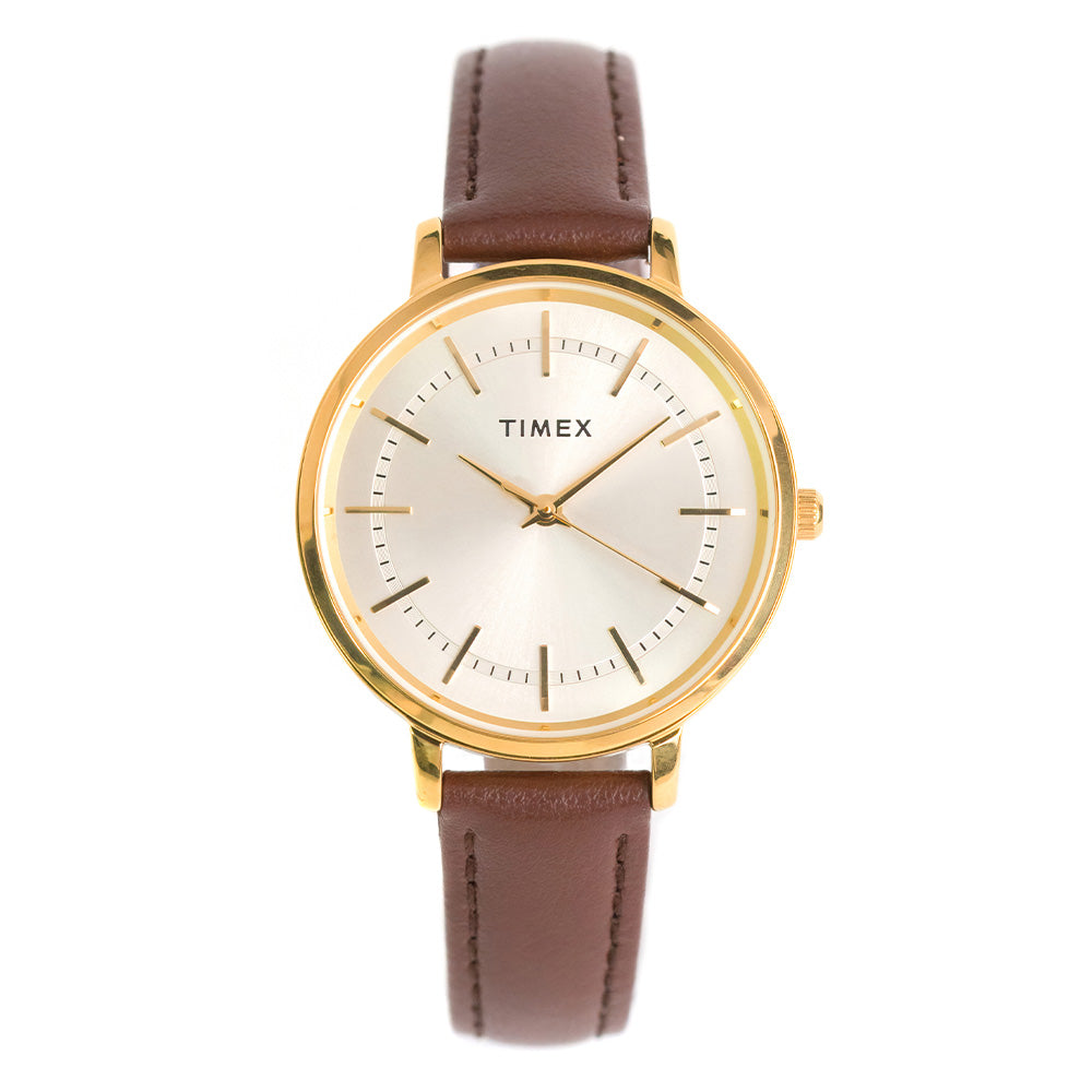 Show off your chic, modern style with this elegant Timex watch. Ideal for a day at the office, this time-keeping accessory looks great paired with professional attire. The feminine design and minimalist display of this watch is certain to turn heads and garner compliments.