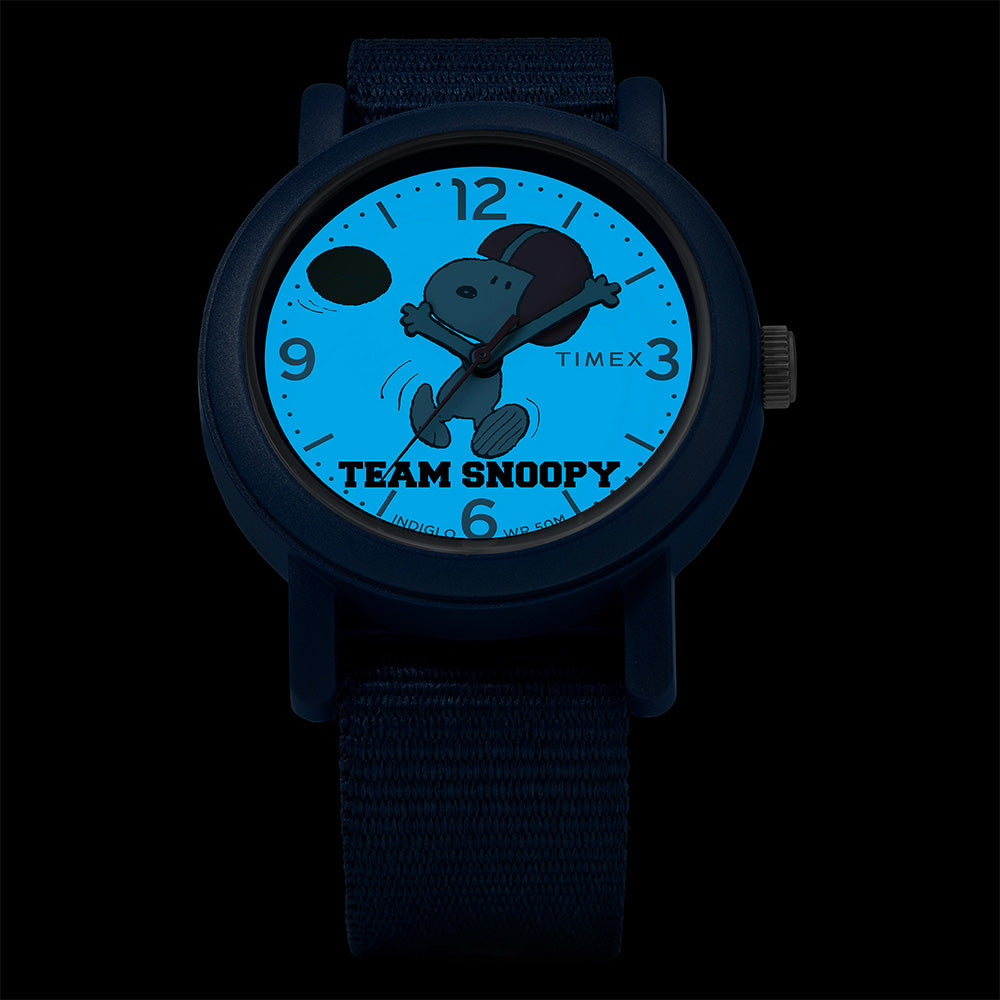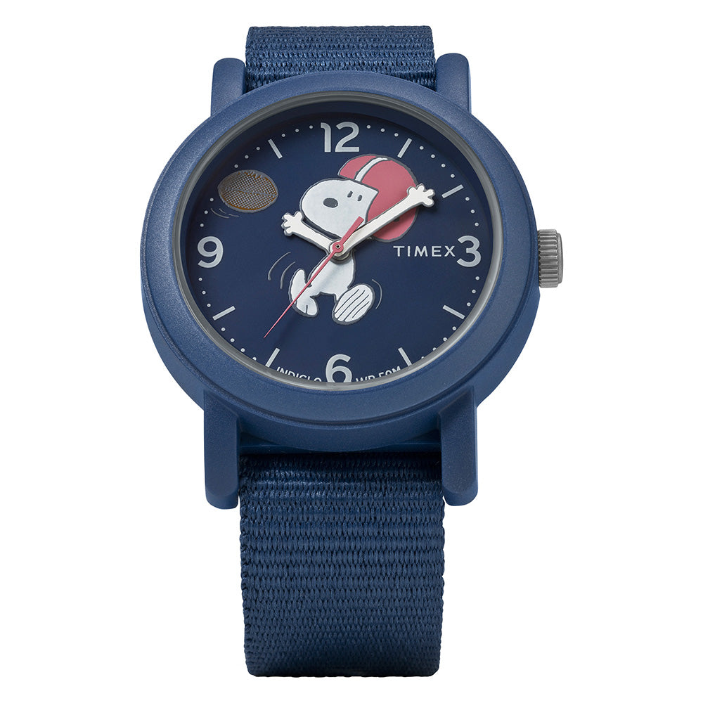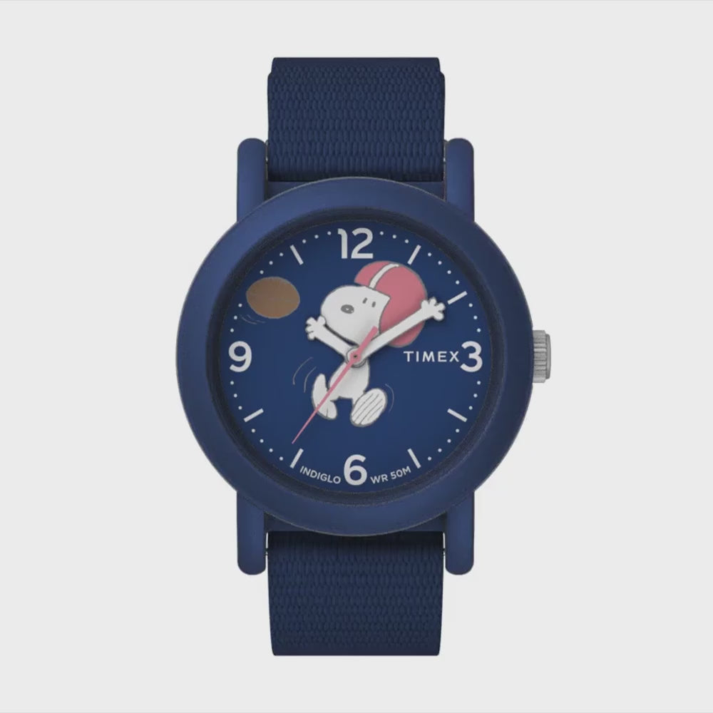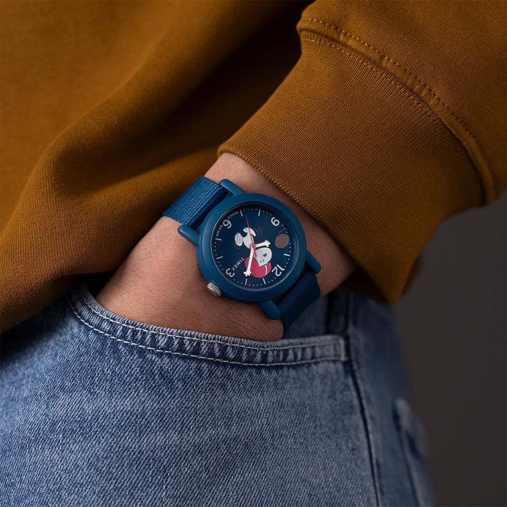 Let Snoopy tell the time. We?ve teamed up with the Peanuts gang to put your favorite characters on your wrist. Snoopy?s arms move as the watch hands and the fabric slip-thru strap coordinates with his red baseball cap.