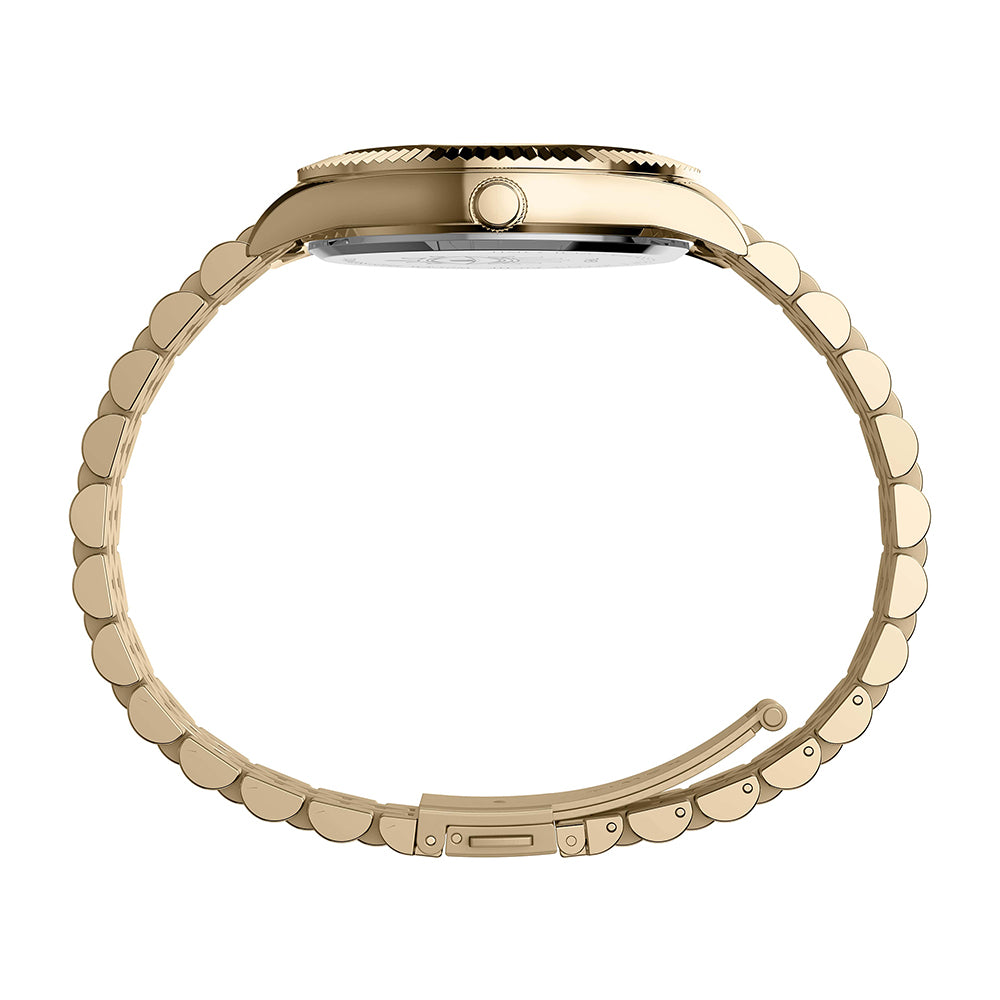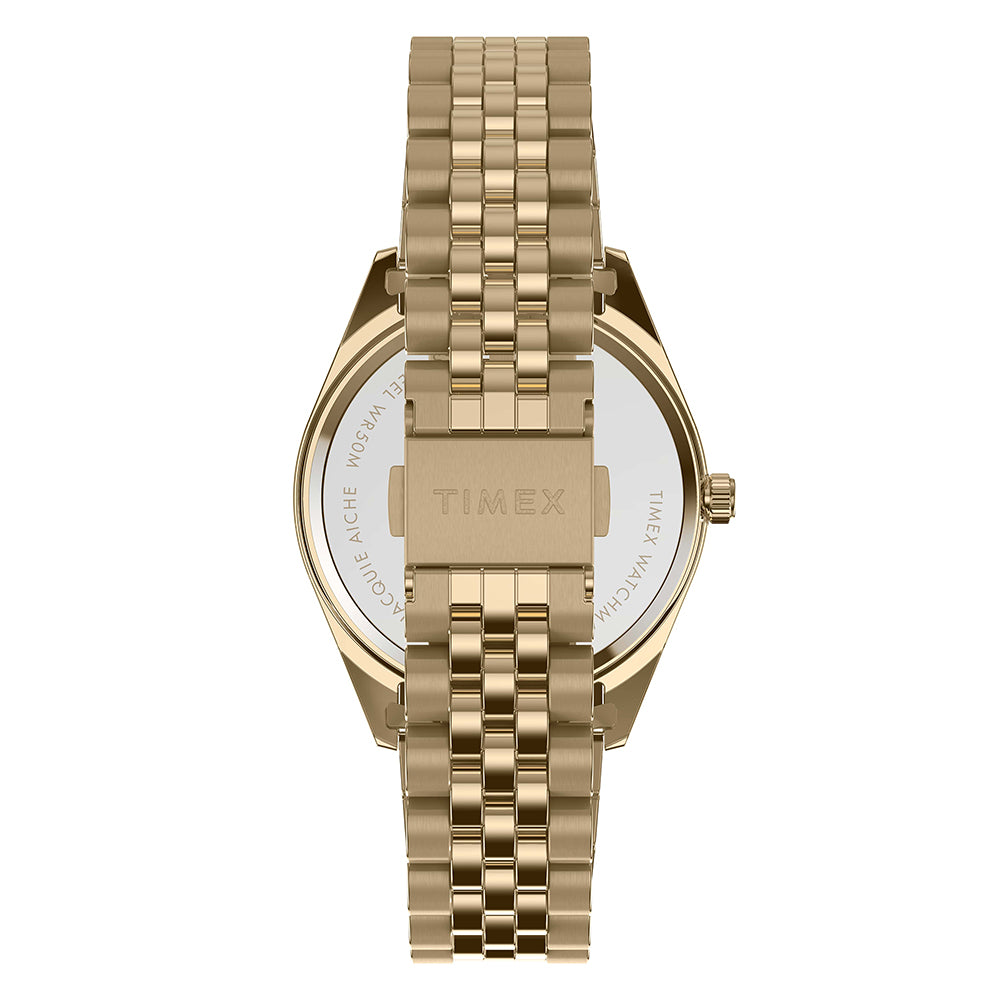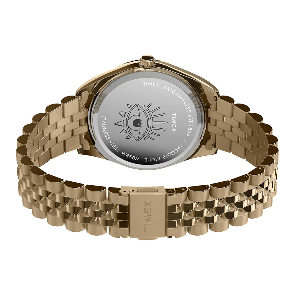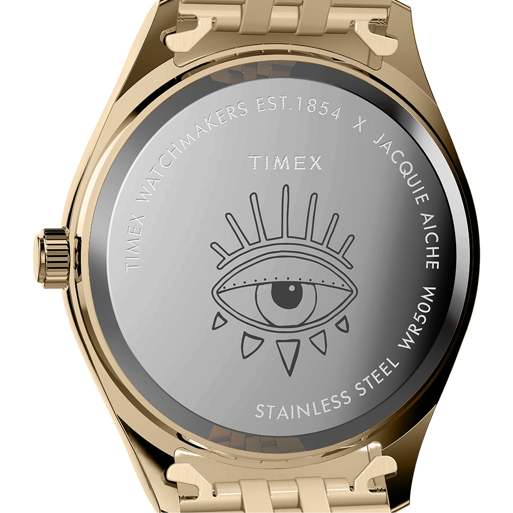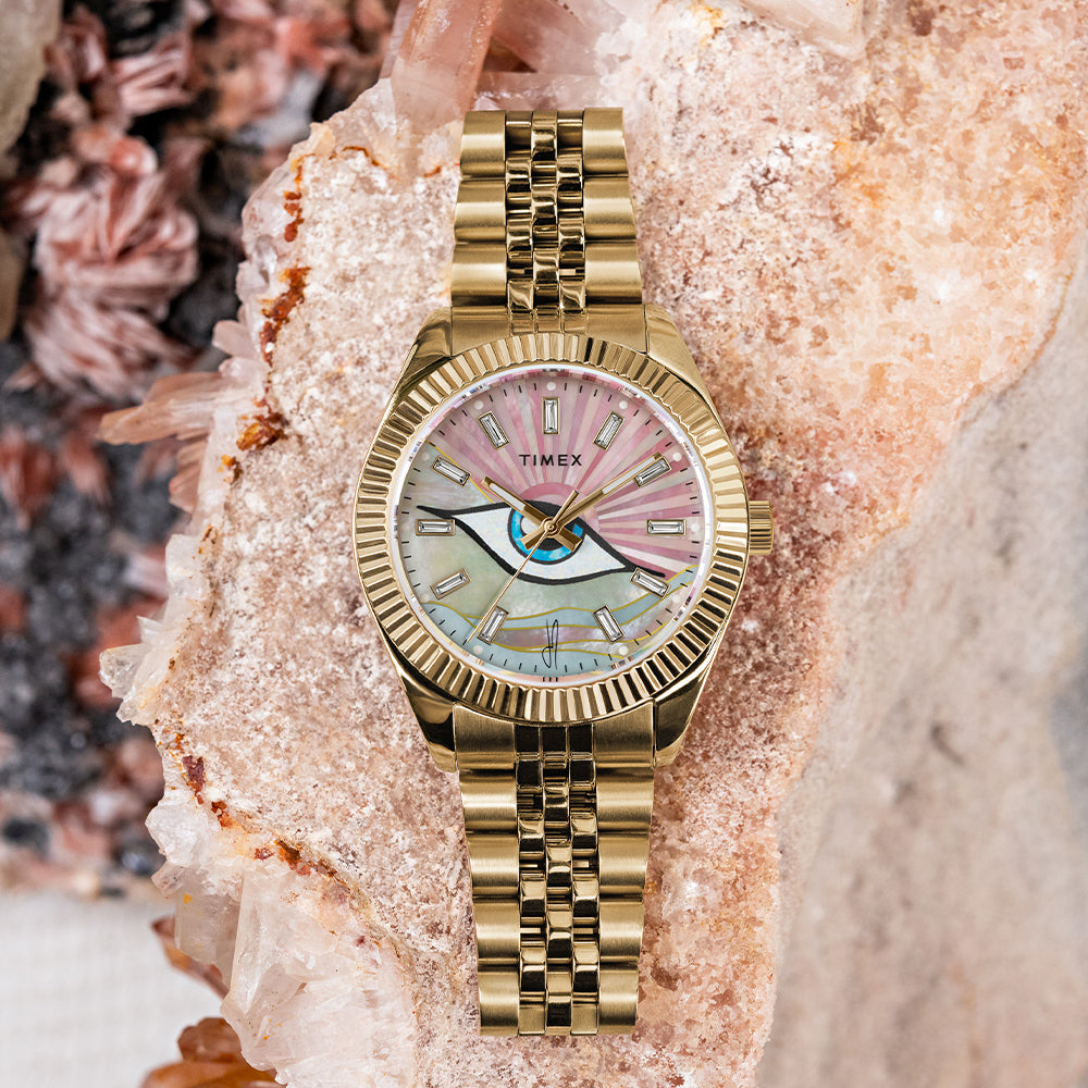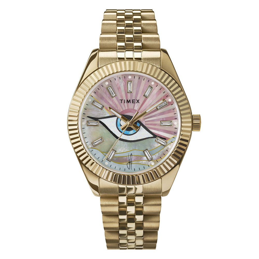 Designed to be a talisman of clarity, protection, and trust in the journey ahead, the Timex x Jacquie Aiche Guiding Light timepiece features a mosaic dial pieced together from shimmering mother-of-pearl. Central to the design is Jacquie’s signature tribe eye motif, with the brilliant beams of the sun above and the soothing waves of the sea below. Faceted Austrian crystals mark the hours, while the 36mm gold-tone stainless-steel case and bracelet illuminate your wrist stack with a warm glow.