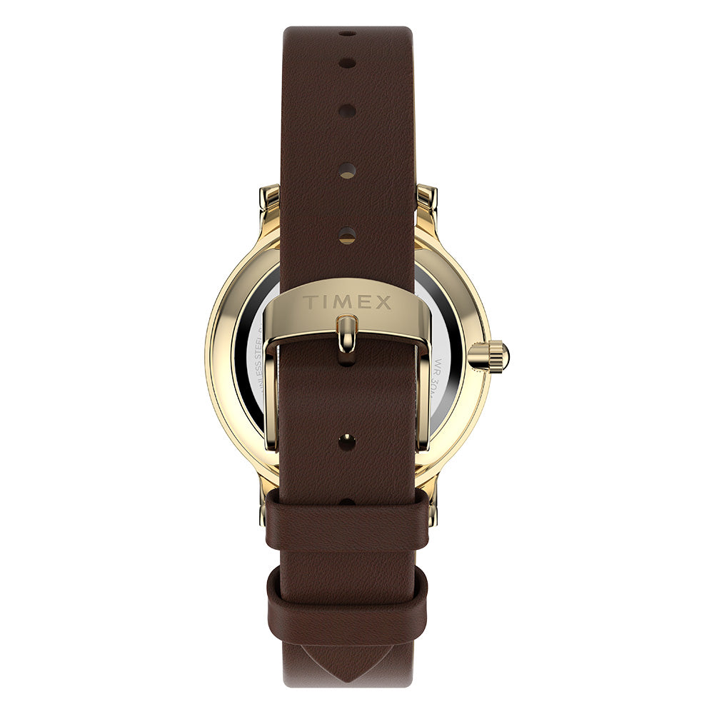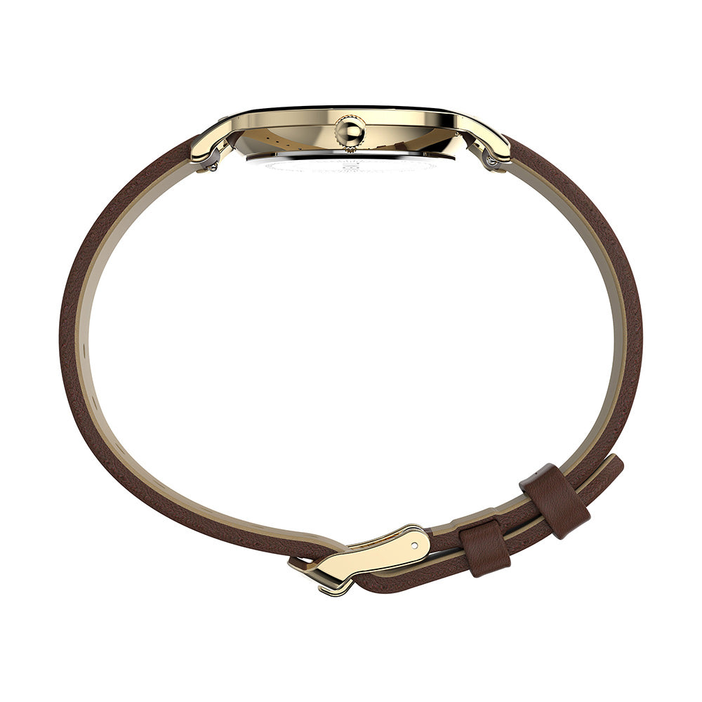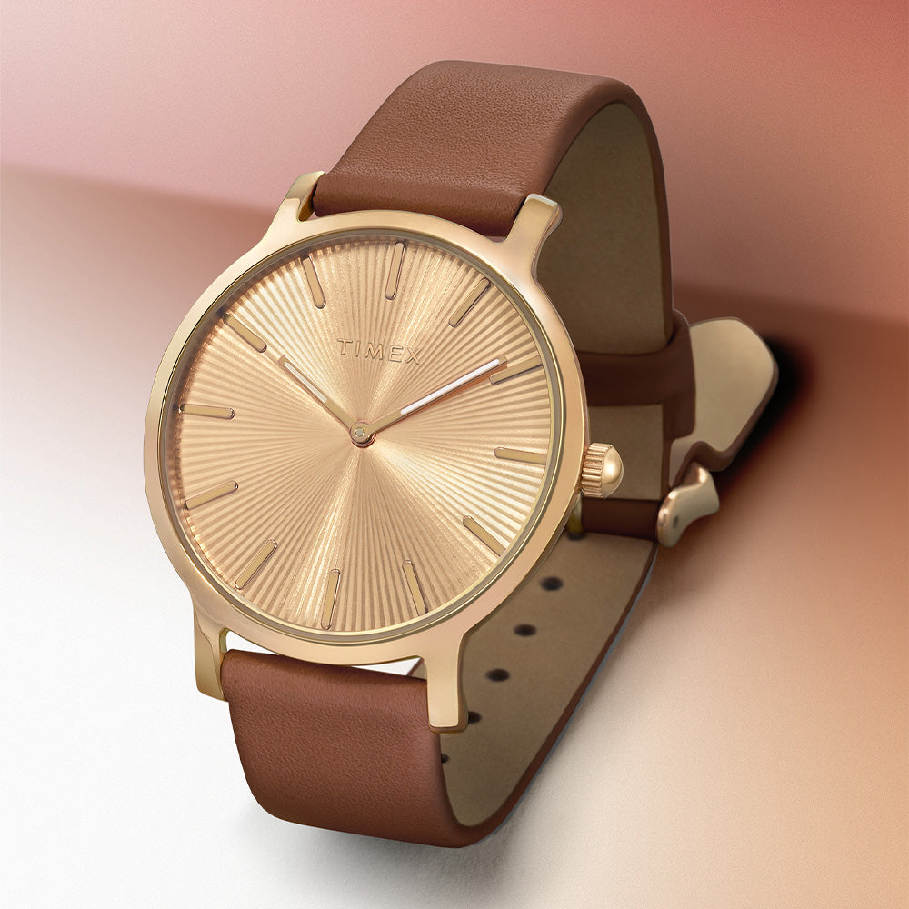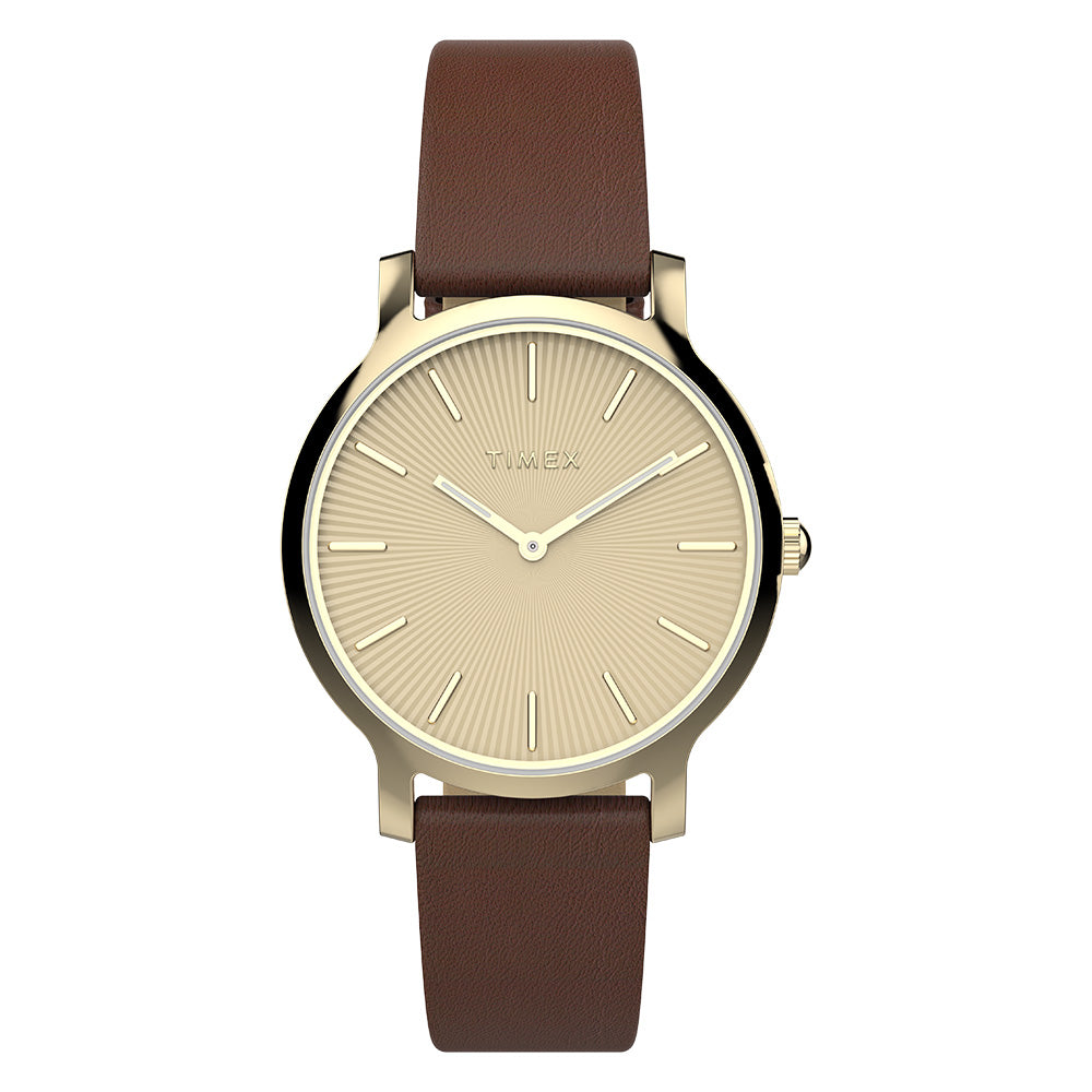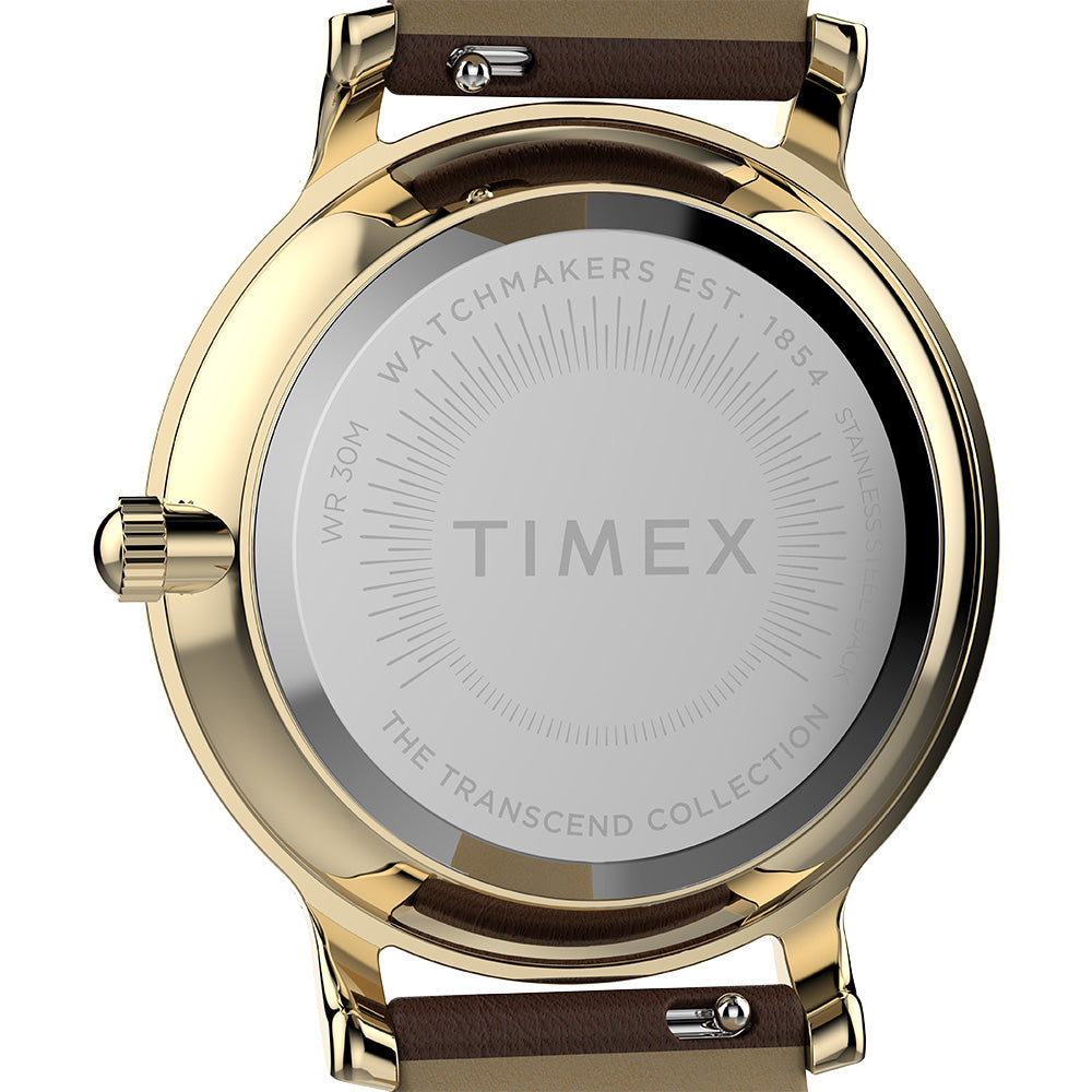 A minimalist wristwatch for lovers of contemporary style, Transcend is a staple collection known for its thin case profile and classically feminine aesthetic. A textured gold-tone dial featuring a unique handset is the pièce de résistance of this glamorous update, while a 34mm case gleams with striking hour markers. A natural leather strap in brown with quick-release spring bars not only offers a versatile wearing experience, but also a touch of sophistication to an otherwise understated design.