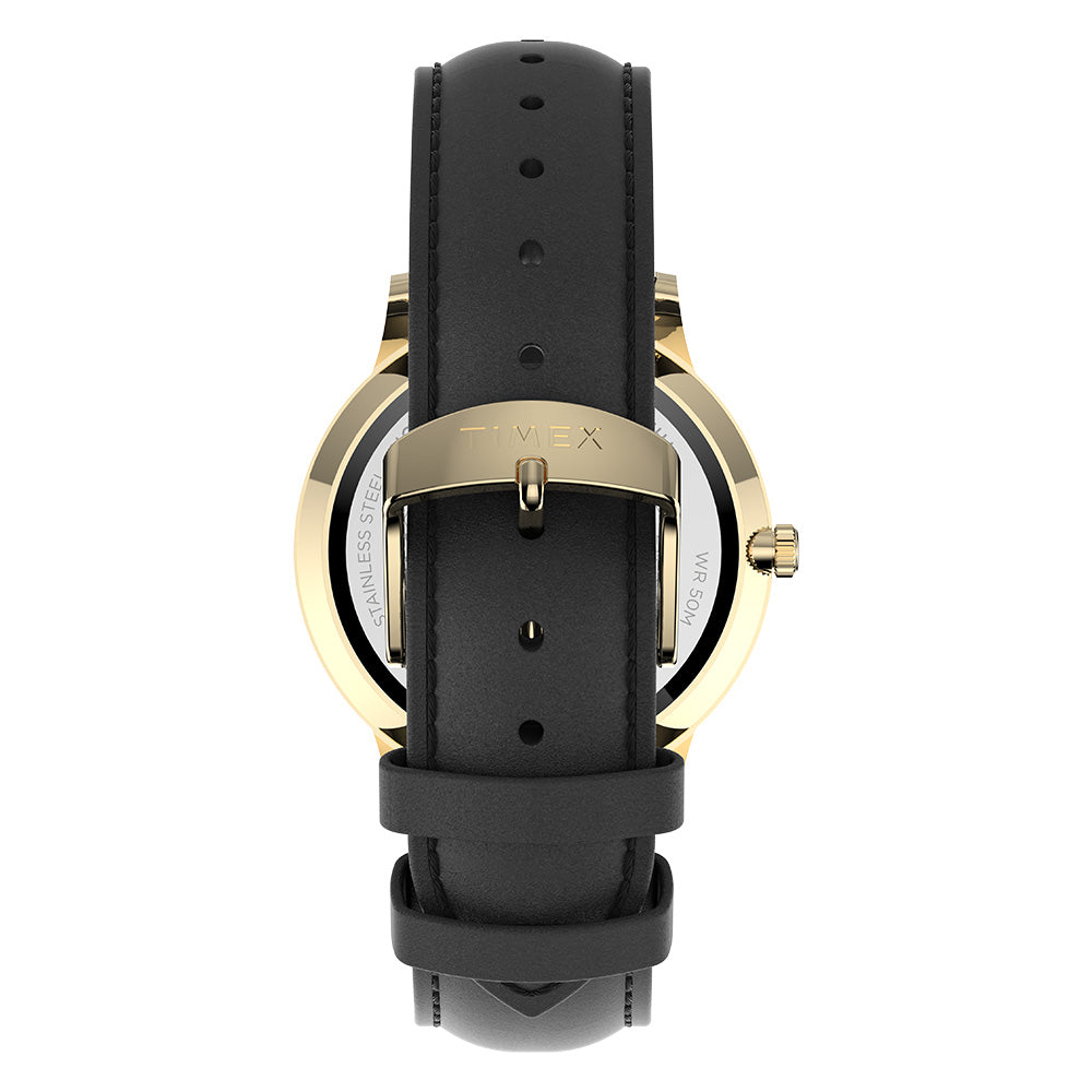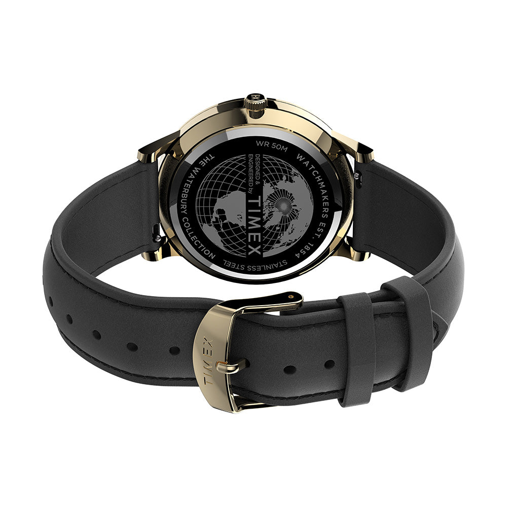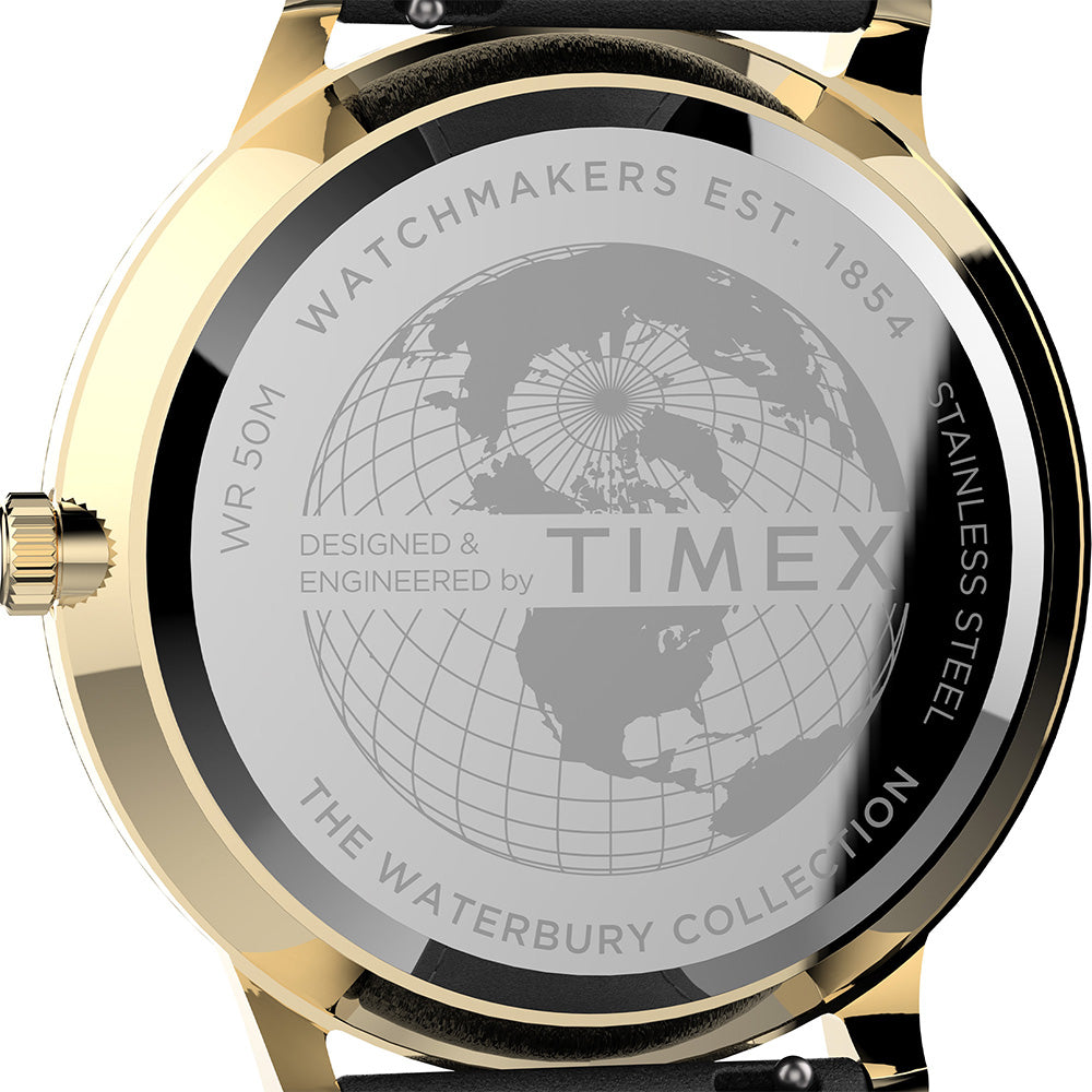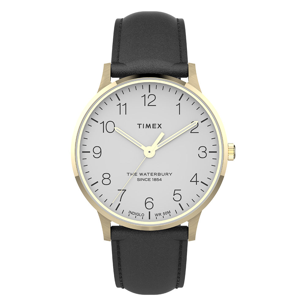 Meet the next generation of an ongoing classic. We traced back to our beginning in 1854 as the Waterbury Clock Company and found new ways to bring our heritage of craftsmanship and authetic watchmaking into the modern day. This watch features a meticulously stitched black natural leather strap, gold-tone stainless-steel case and white dial that offers a wearing experience with ageless aesthetics.