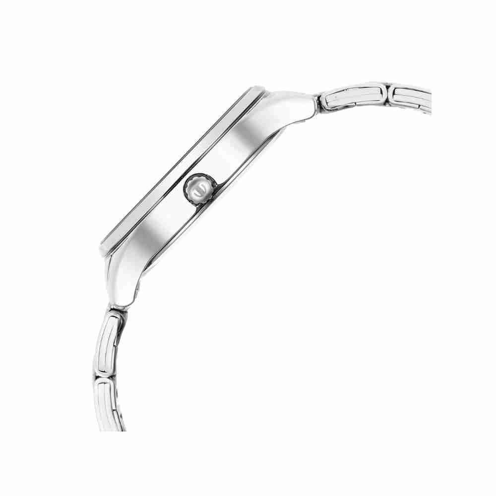 This silver-colored watch with a mother-of-pearl display has a 36mm stainless steel-plated brass case, 8mm thickness, P3H+ date capability, and 5 ATM water resistant.