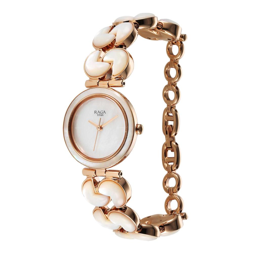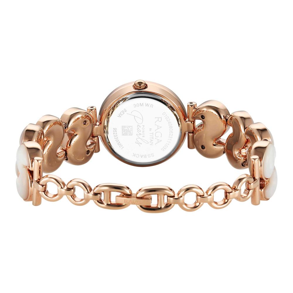 Stand out with this refined piece from the Raga Power Pearls collection. Featuring an all-pearl appearance, including a mother-of-pearl dial and unique links, it adds an elegant touch to any outfit. Finished with a striking bracelet featuring a mother-of-pearl mosaic design, it delivers a glamorous stacked look.