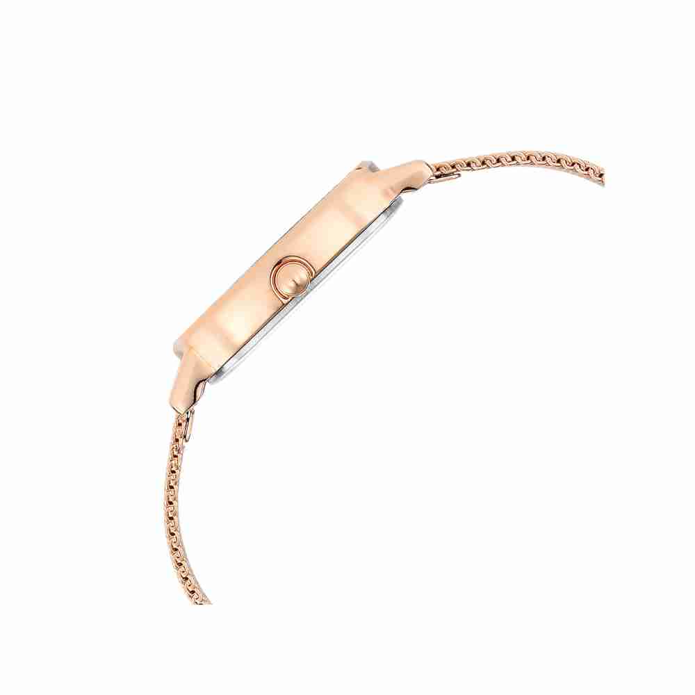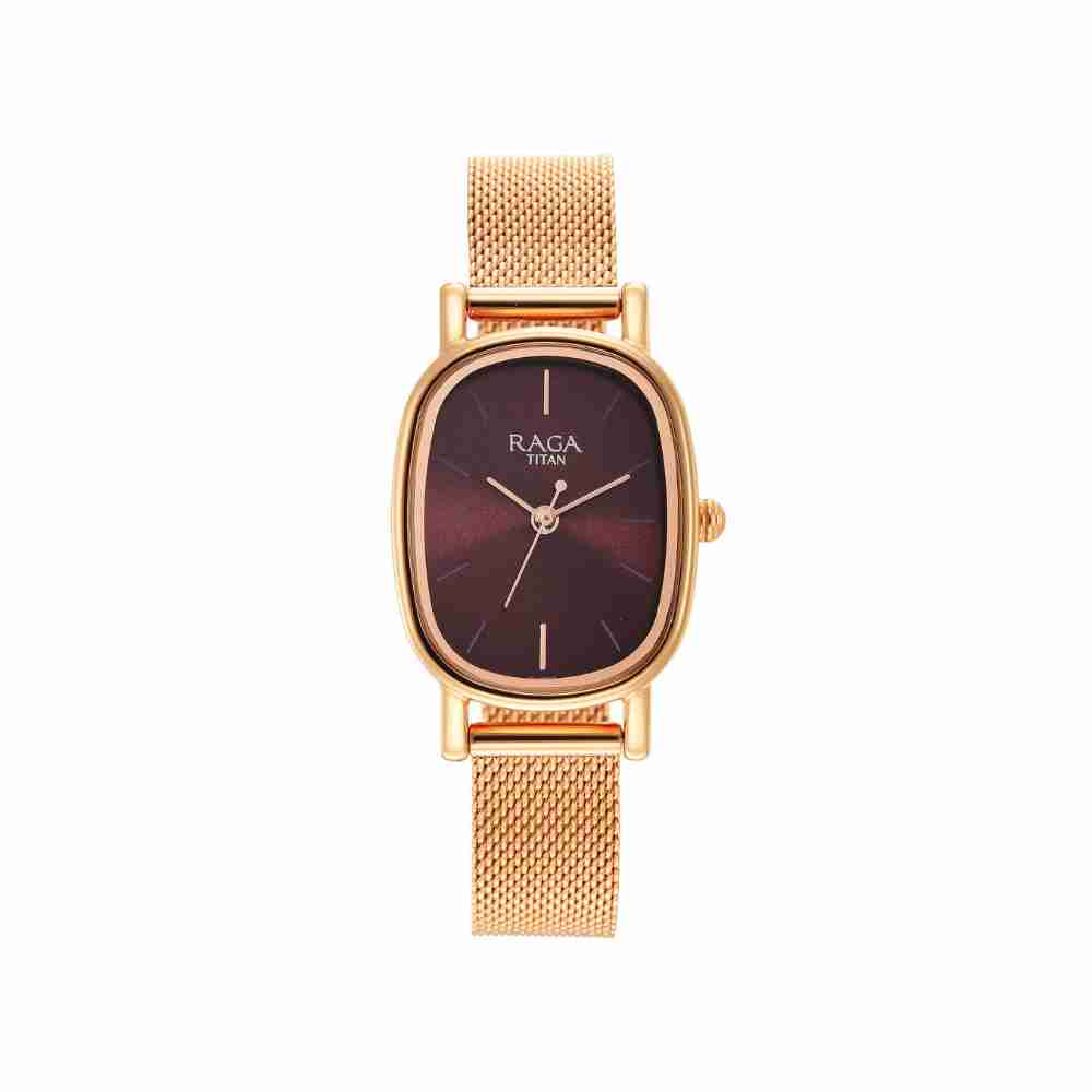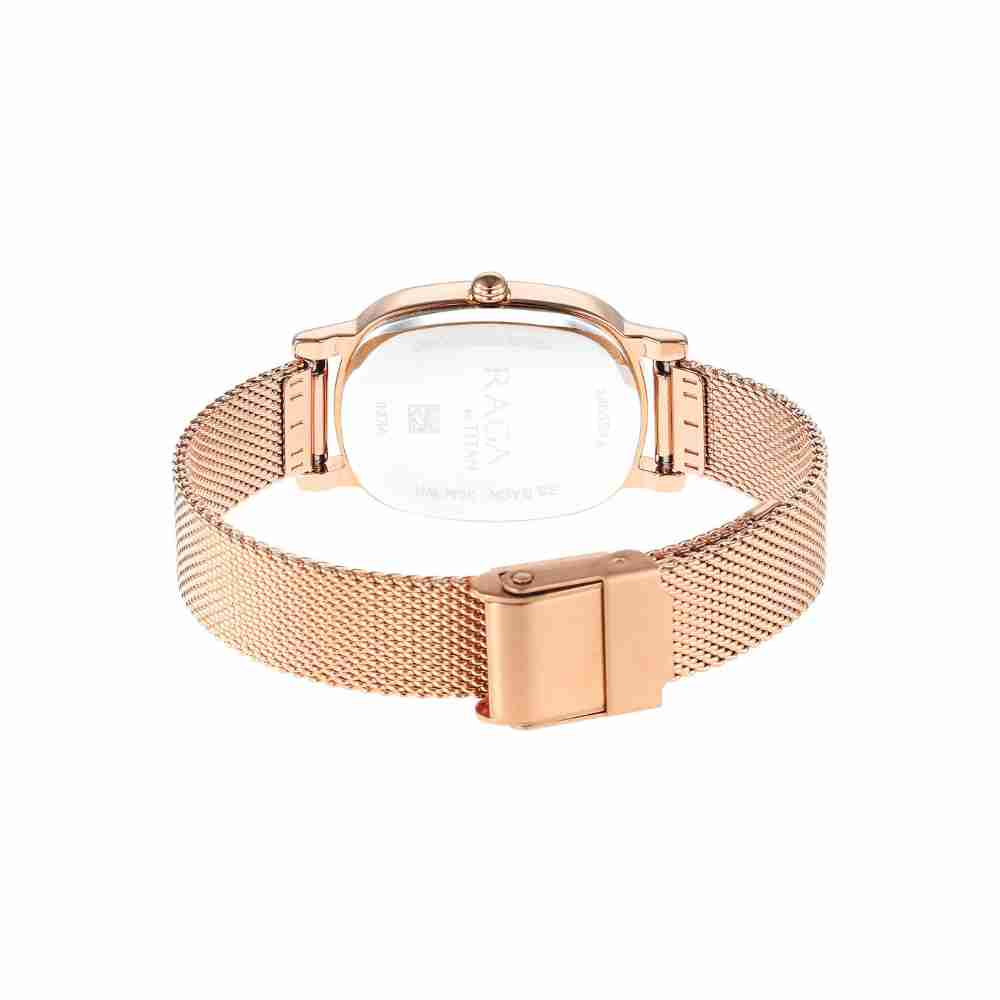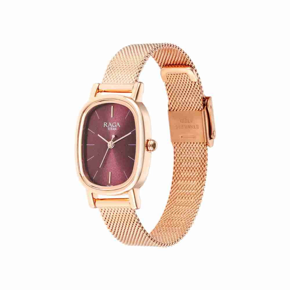 This Titan Raga analog watch for women is the peak of refined style. The rose gold mesh strap of the watch adds a lovely touch. It features a straightforward design with three hands and a crown for setting the time. It is also completed with a hook buckle clasp to ensure that it stays on your wrist.