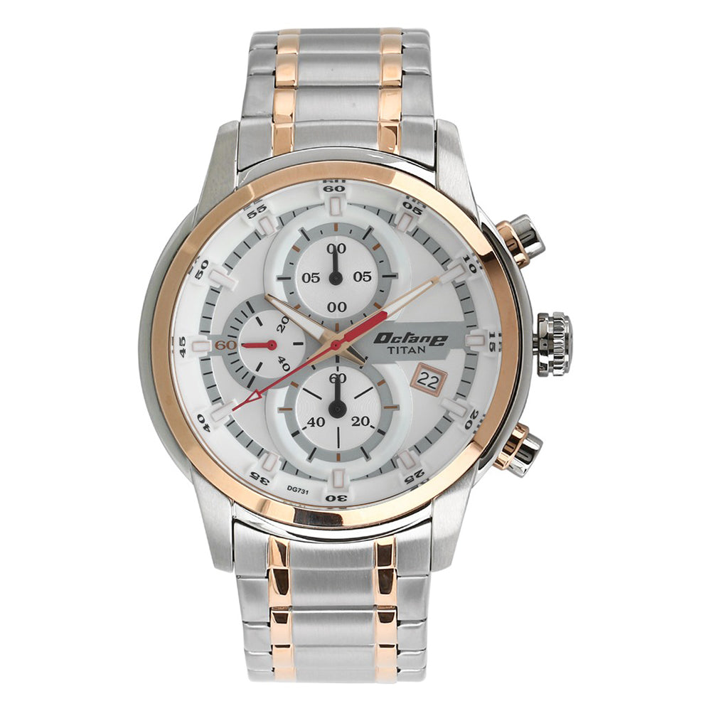 This classic men's watch from the House of Titan radiates steely strength to fuel the modern man. The high-energy Octane collection timepiece features white hands outlined in gold and a vibrant red seconds hand against a pure white dial with white, embossed digits. This watch oozes precision and glamour to be the perfect acquisition for the man who doesn't think twice.