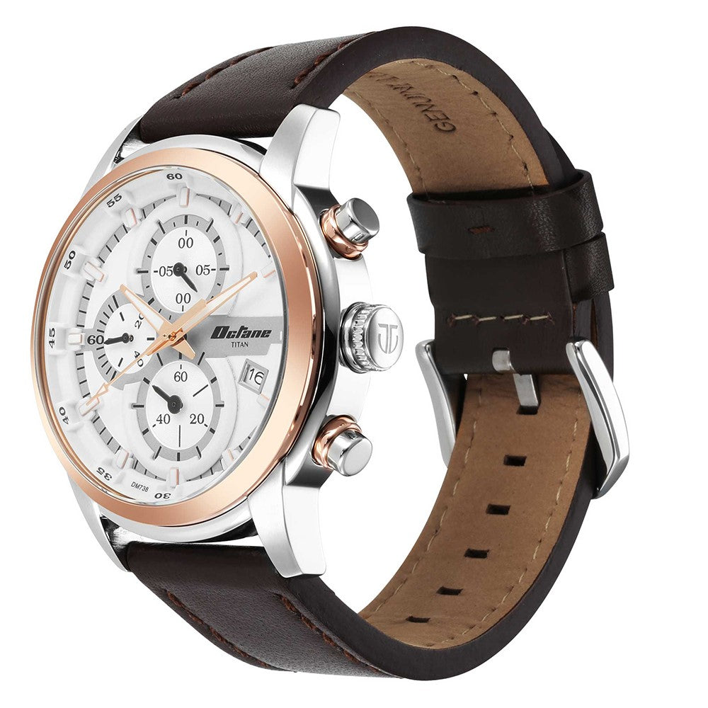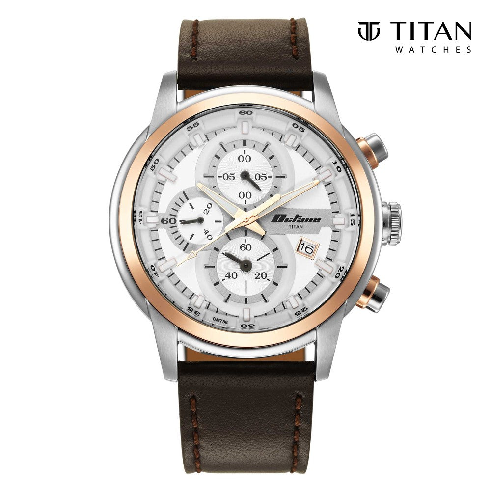 The Titan Octane combines bold design with precision. Its sleek silver dial is housed in a sturdy stainless steel case, paired with a rich brown leather strap for a striking contrast. Powered by reliable quartz movement, it features an analog display with a date function for added convenience. The push-button diver’s clasp ensures a secure, comfortable fit, making this timepiece the perfect blend of style and functionality for the modern man.
