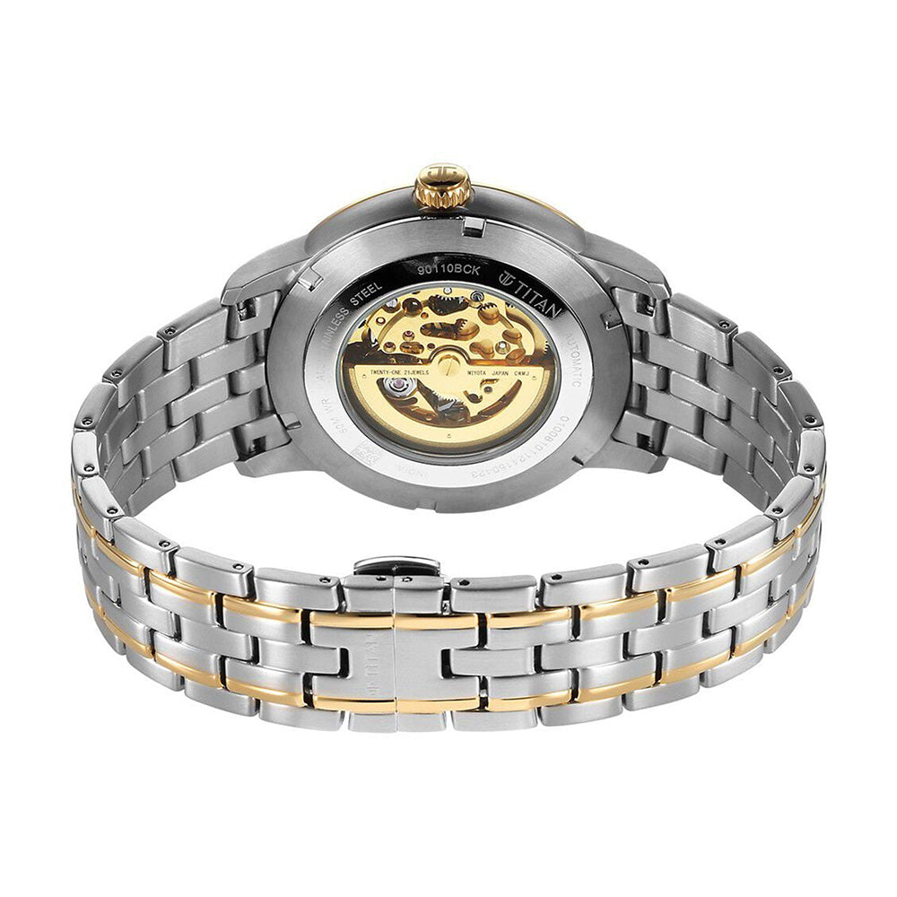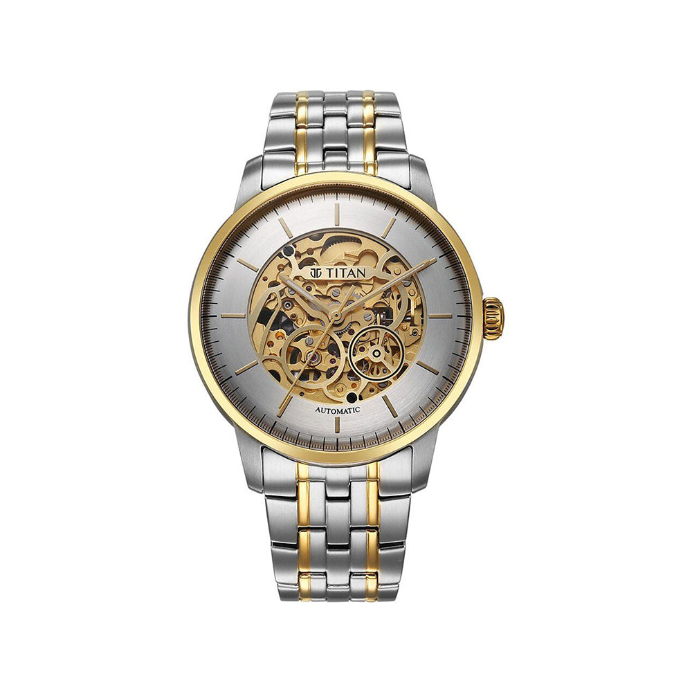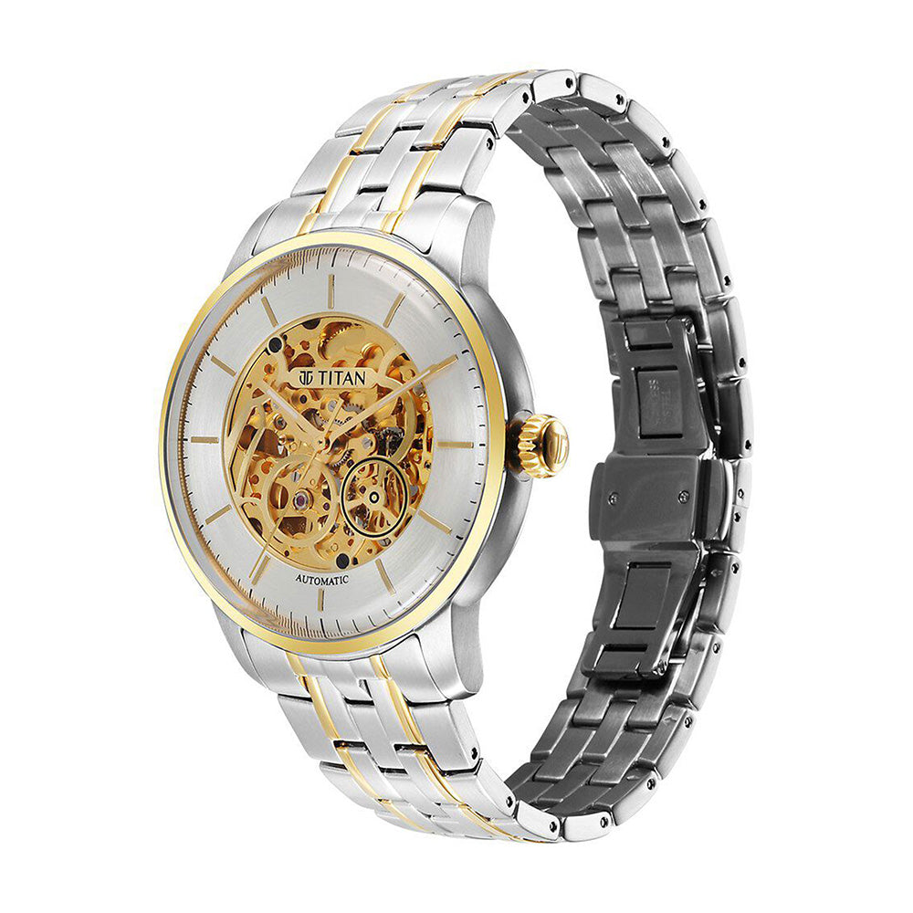 The Titan Golden Heart Skeletal Automatic Analog Watch for men is a statement of opulence, featuring a gilded skeletal dial that beautifully showcases its intricate automatic movement. Designed with refined details such as a golden-tone bezel, applied indices, and luminous hands, it exudes sophistication. Crafted in dual-tone stainless steel with elegant gold accents, this timepiece houses a 21-jewel movement operating at 21,600 bph with a 42-hour power reserve. Perfect for formal occasions, celebrations, and soirées, it blends luxury, craftsmanship, and timeless style in one remarkable design.