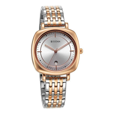 The rich mix of rose gold and silver makes this watch from Titan?s Shaped Cases range an easy way to elevate your style. ?Also, this watch has a stainless steel bracelet, a rose gold bezel, a 7.05 mm thick case, skeleton hands and a date function.