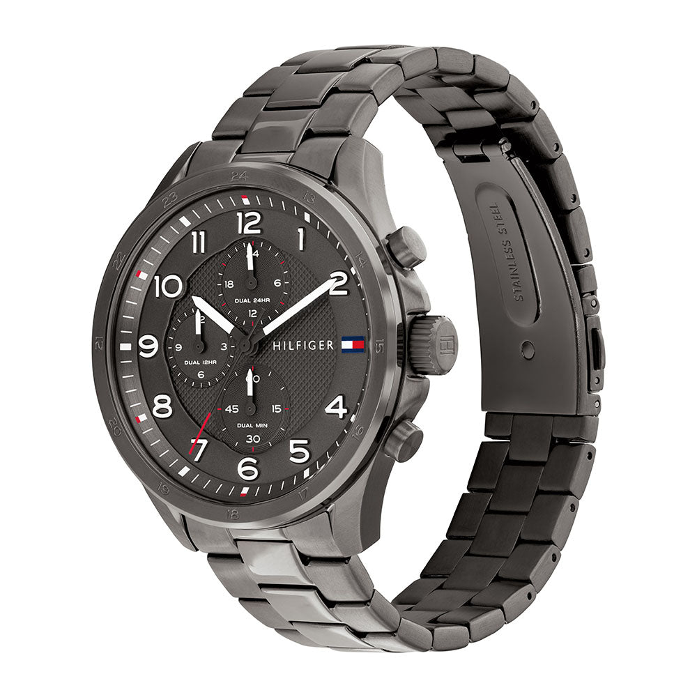 Tommy Hilfiger men's watch for the explorer in you. Rugged and detailed. Multi- function, and multi textured dial with Lumi arabic markers. Multi-function, 44MM