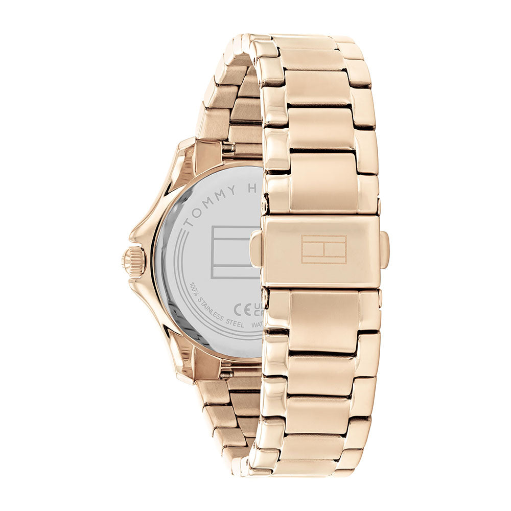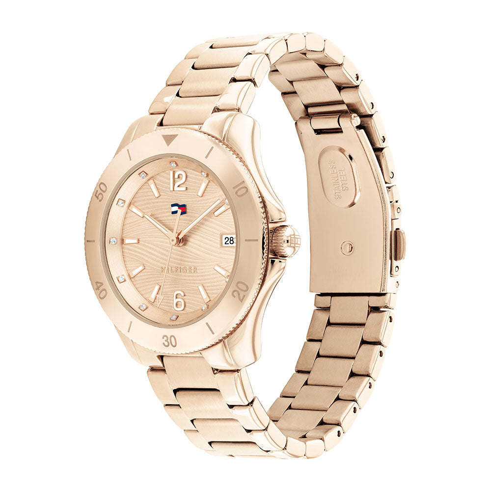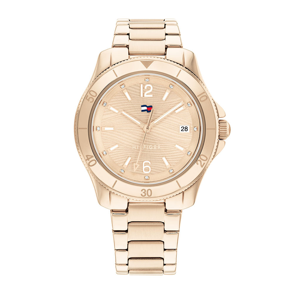 Tommy women's watch in the DIVER tradition. The elegant wave textured dial brings a fun nautical element perfect for the Summer. New wave TH Flag with date window on link Bracelets, Silicone & Sustainable Straps. 3H, 36MM