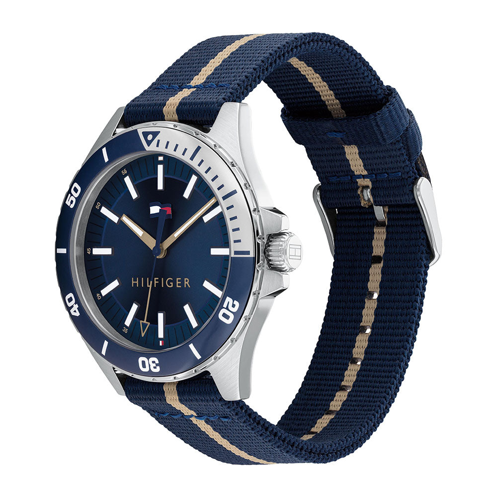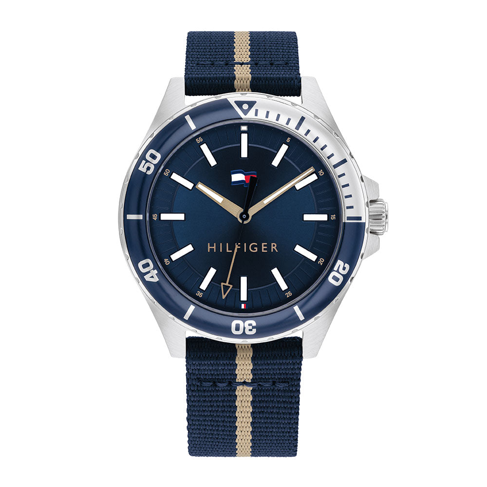 Tommy Hilfiger men's watch diver inspired with full sunray dial and Lumi indexes, Etched minute track, and new wave flag embody the Tommy adventurous spirit. 3H, 43MM