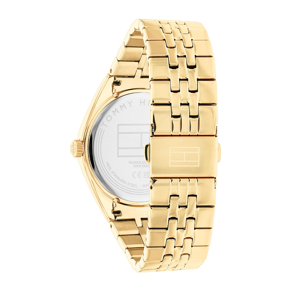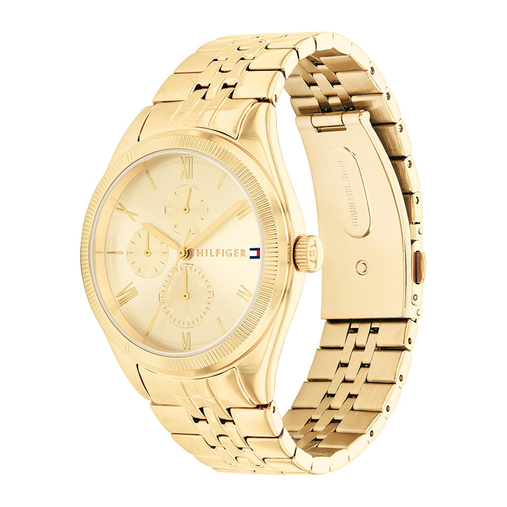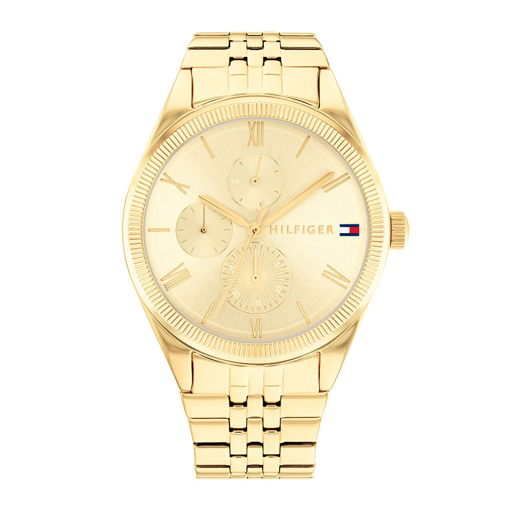 Dress to impress with this Tommy Hilfiger watch for her. A coin edge texture on the bezel and a dial featuring roman numerals makes this timeless piece a must have. Link bracelets and leather straps. Mullti-function, 38 MM