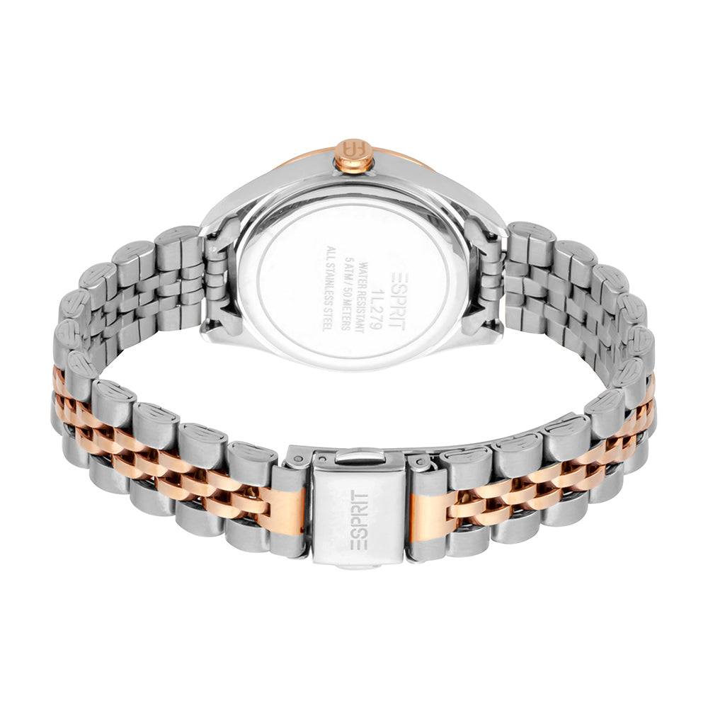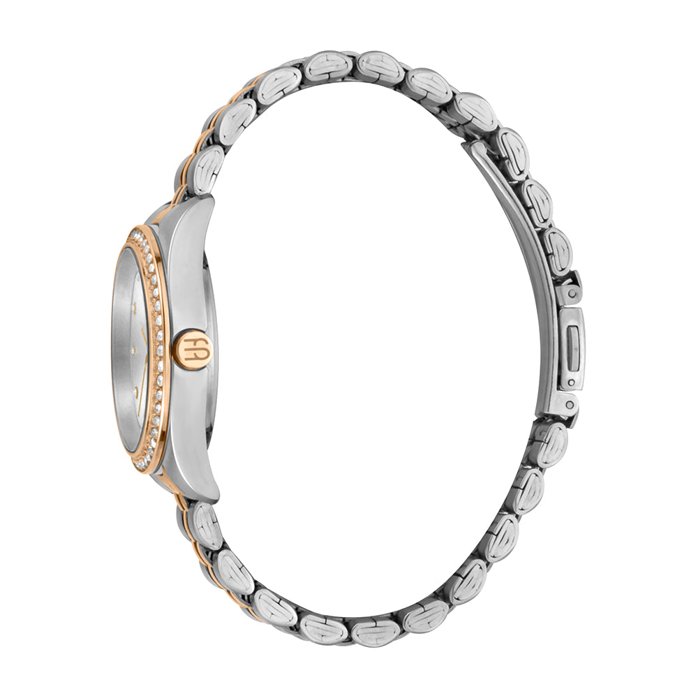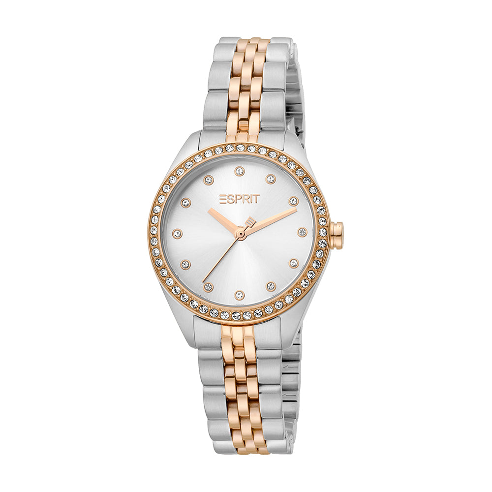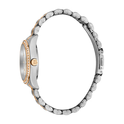A bezel trimmed with sparkling zirconia stones gives this two tone stainless steel watch an elegant and glamorous update.
