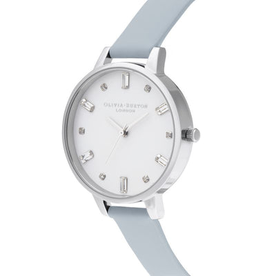Elevate your everyday style with this luxe timepiece. A crisp white dial is adorned with sparkling swarovski crystal stones and baguette hour markers with a contrasting silver coloured case. The piece is finished with a complimentary vegan chalk blue strap, helping you stand out from the crowd.
