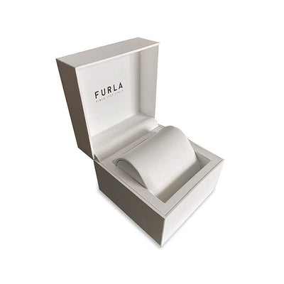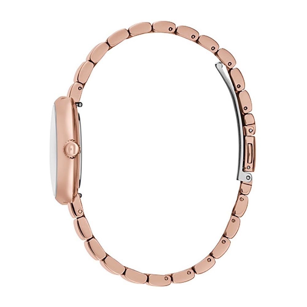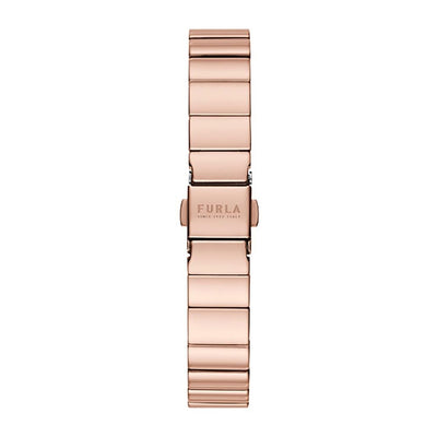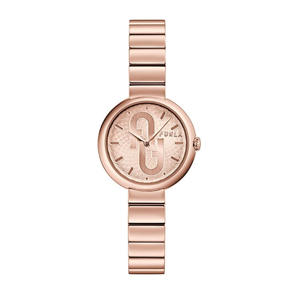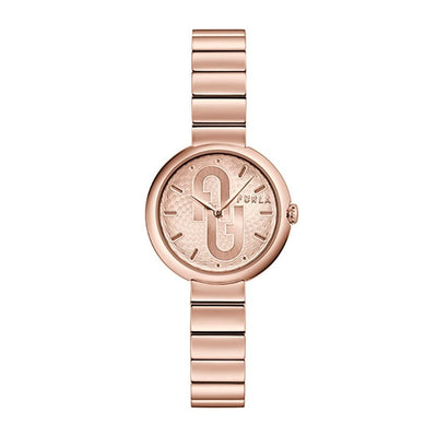 Perfectly rounded, this logo-centric timepiece in rose gold tone offers playful yet sleek sophistication with a swirling guilloché dial with the entwined tone-on-tone Furla Arch logo, on matching rose gold strap.