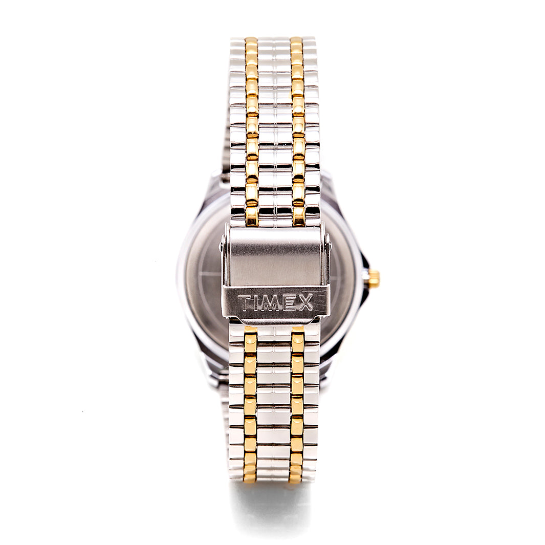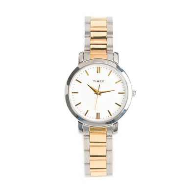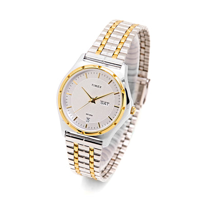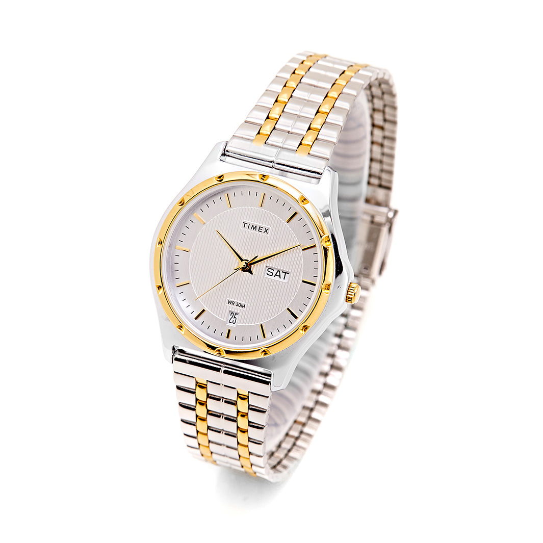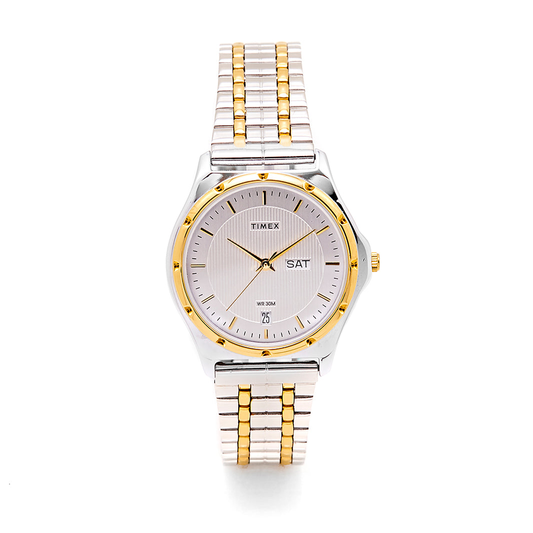 This distinctive Timex watch will add a touch of contemporary style to your attire. This timepiece features a goldtone case and a sleek white dial with a magnified day display. It is fastened with a two-tone gold plated stainless steel bracelet.