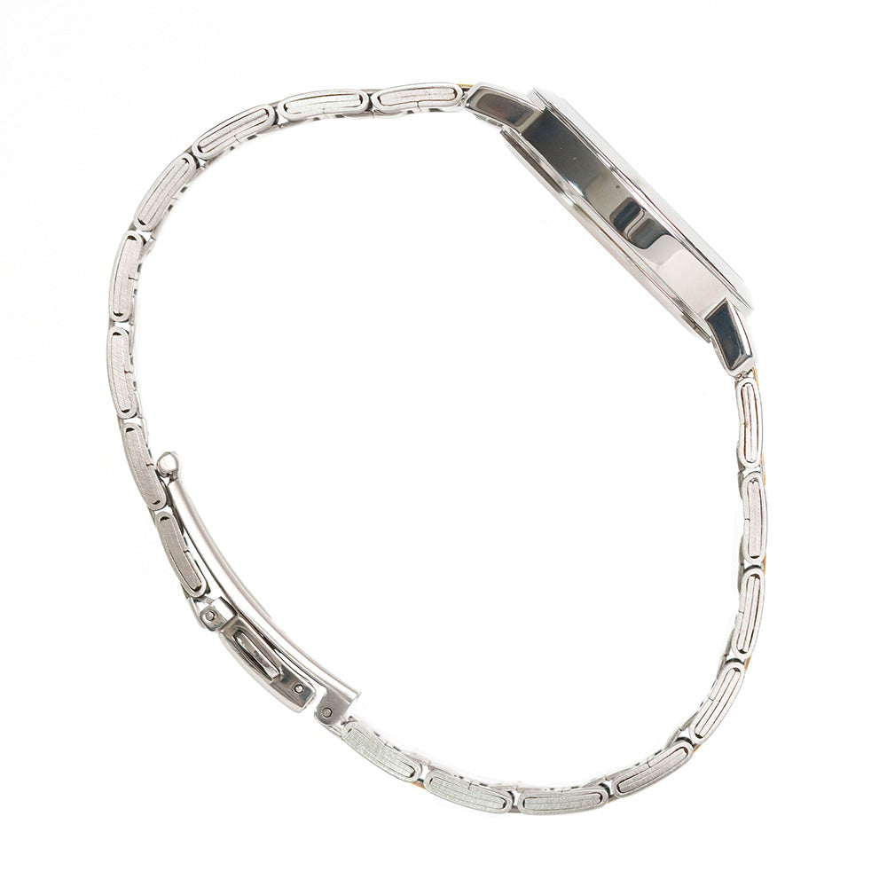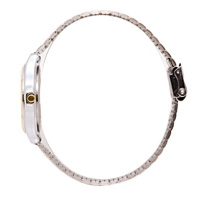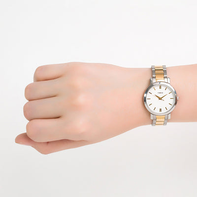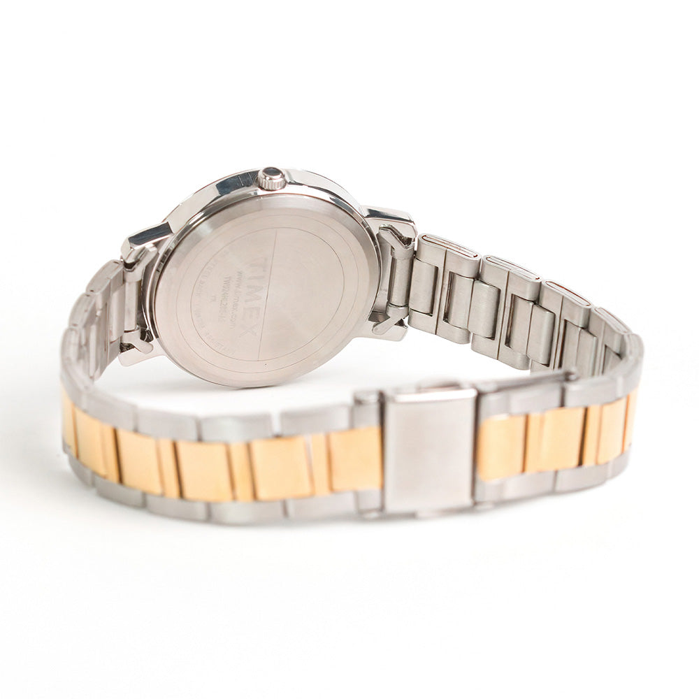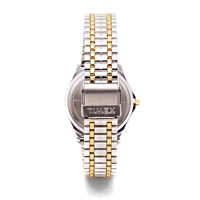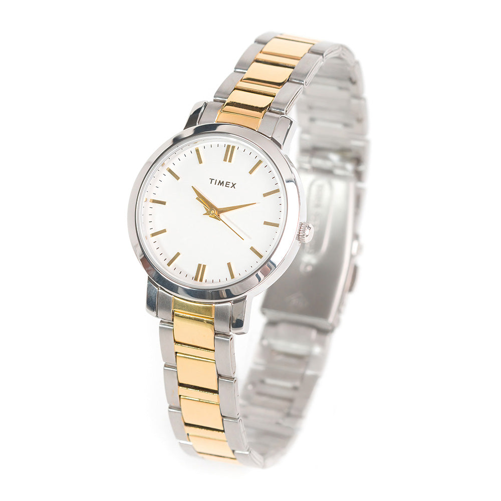 This distinctive Timex watch will add a touch of contemporary style to your attire. This timepiece features a goldtone case and a sleek white dial with a magnified day display. It is fastened with a two-tone gold plated stainless steel bracelet.