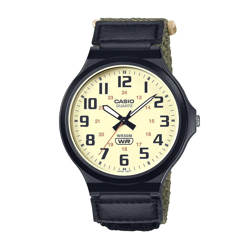 Classic look with an outdoorsy twist a streamlined analog watch with large case and Velcro-fastening band. Orange accents on the dial and two-tone band in earthy colors make for singular design that perfectly complements outdoor fashions. These timepieces are water resistant up to 50 meters to free you from worry, even when out in the rain or washing up.
