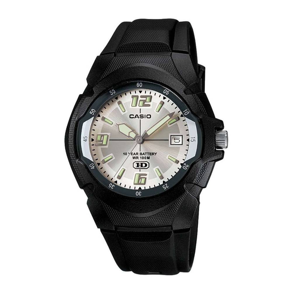 Designed for smart men, Casio men black dial watch has an analog display that allows you to have quick glance at the time easily. Housed on black resin case material, the black dial has small window that showcases date display function. Teamed up with resin strap of 19mm width, this black beauty attracts the onlookers instantly. The durable casing makes it an ideal choice for every day wear. You can even flaunt this Casio analog watch when outdoors even on rainy day and yet remain tension free, thanks to its water resistance up to 100m! You will just love to enjoy adventurous water sports such as sailing, surfing, snorkelling etc with this watch on your wrist.