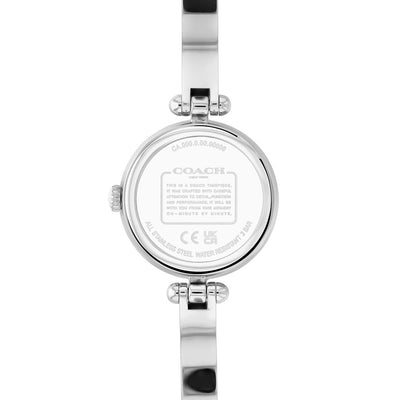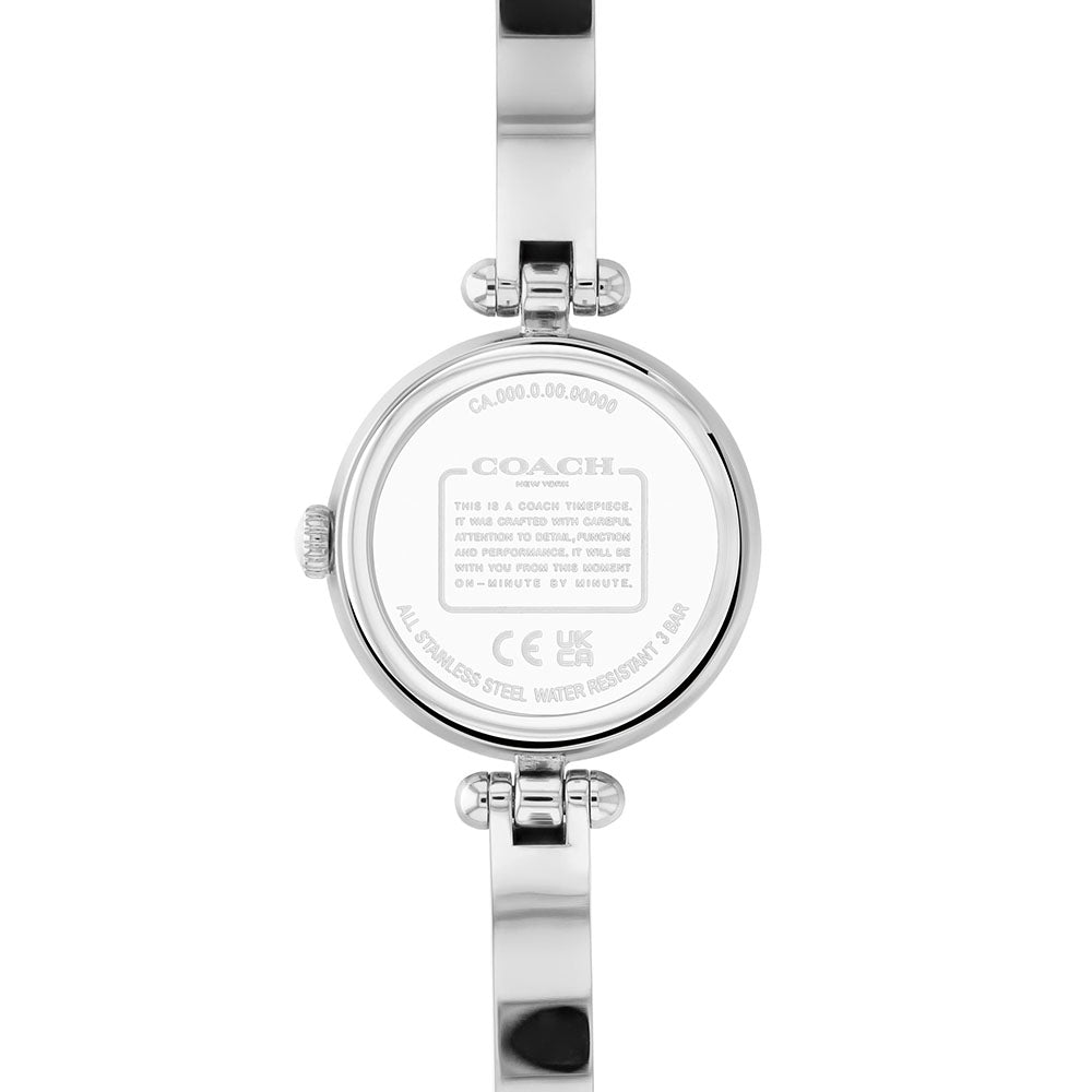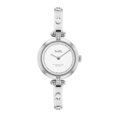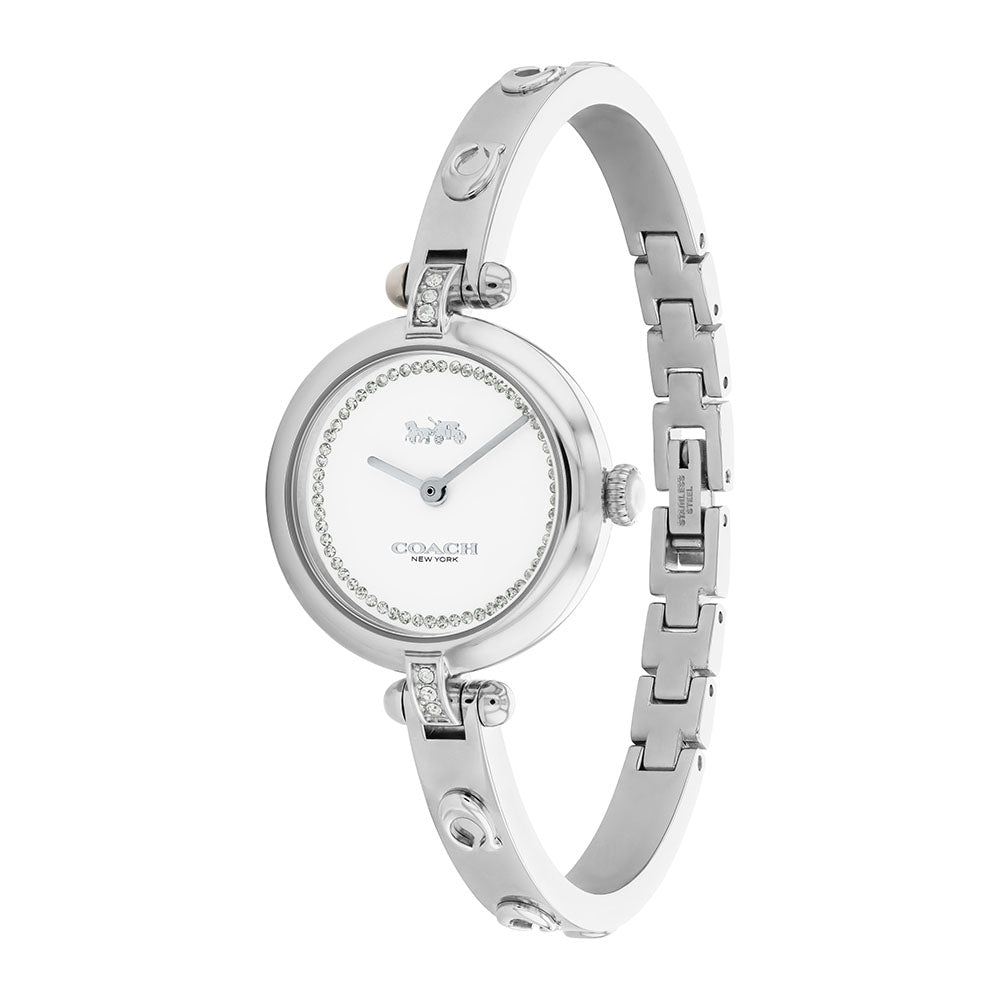 Timeless and elegant, the Cary watch is a sophisticated style perfect for day or night. Accented with sparking crystals and Coach Signature hardware, the sleek stainless steel bangle design features a powder white dial detailed with the iconic Coach Horse and Carriage motif for a heritage touch. It's finished with a self-sizing clasp to fit most wrists.