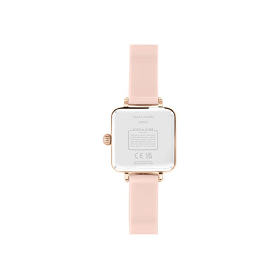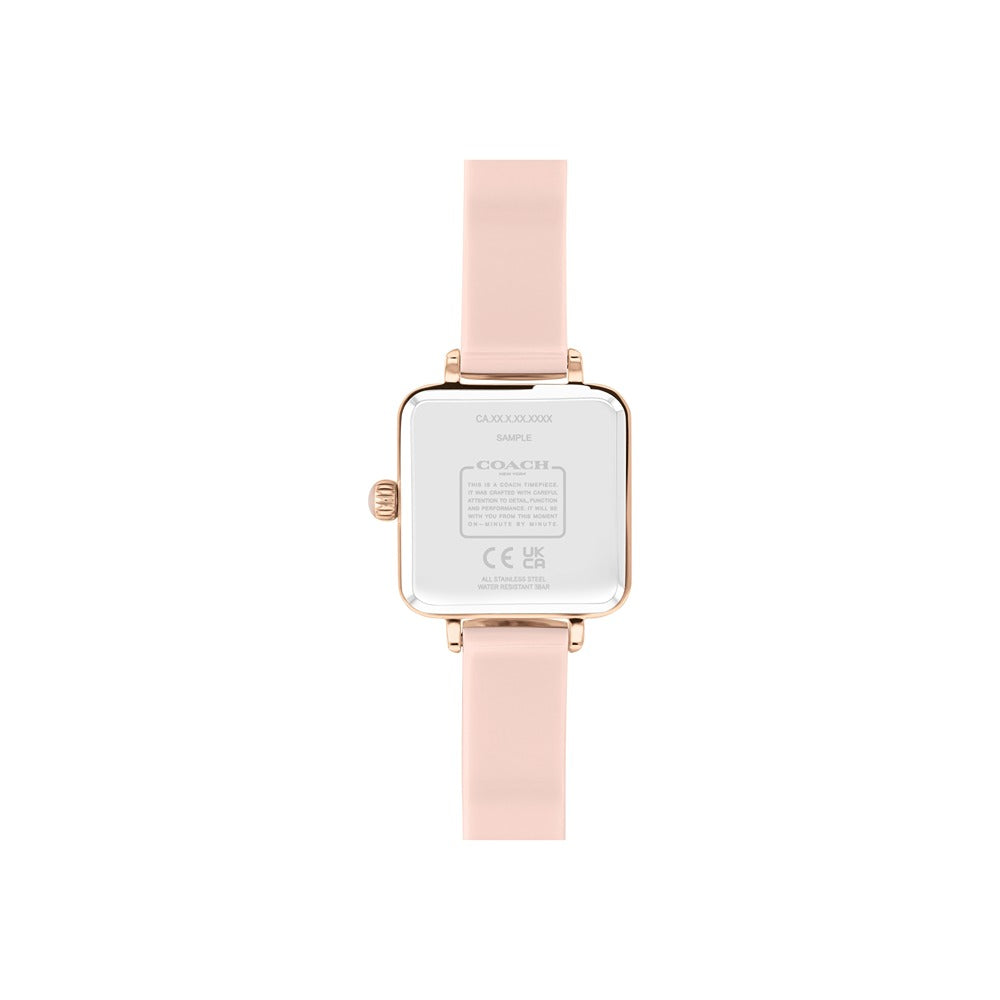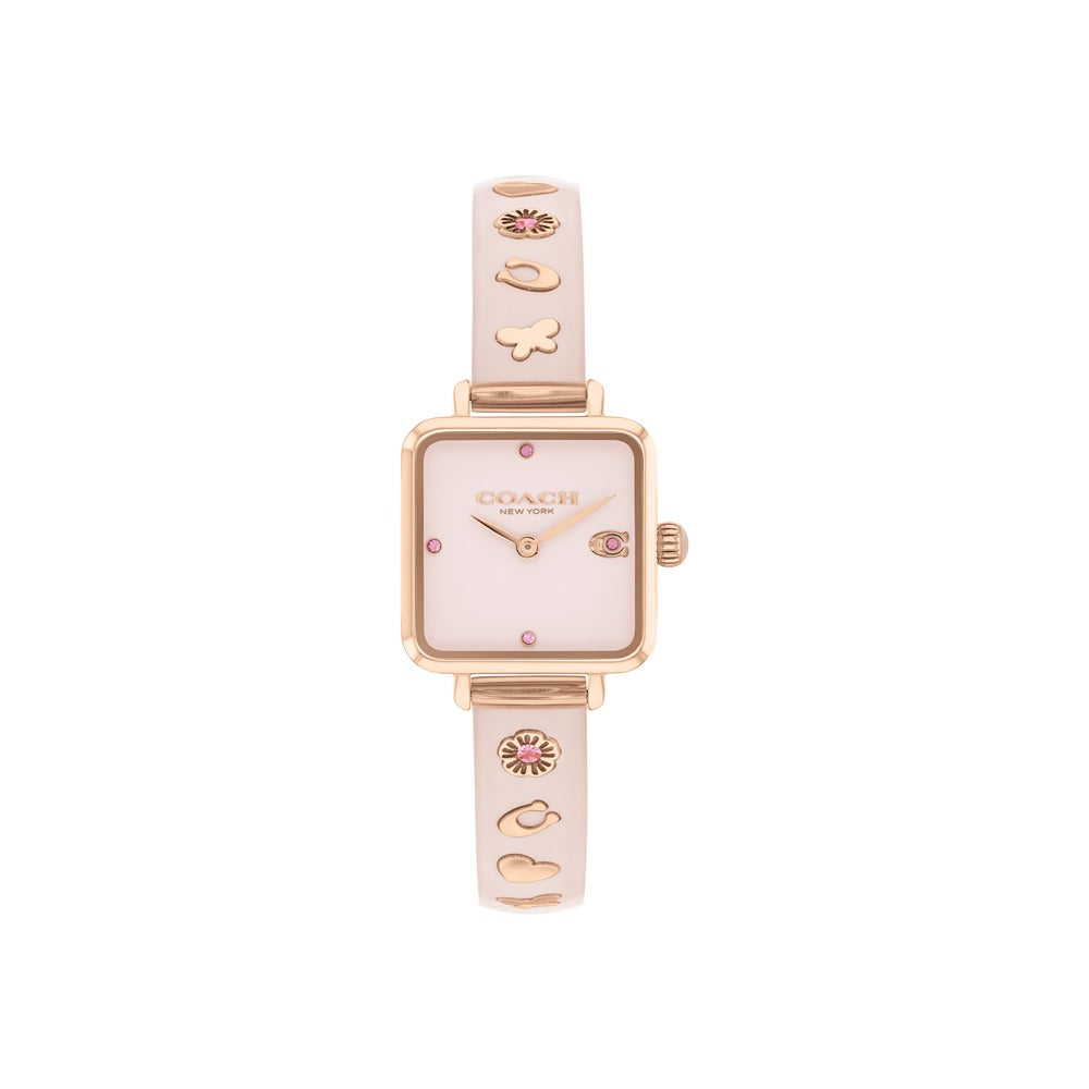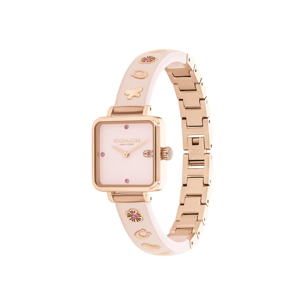 A bold square shape gives the Cass watch modern, distinctive style. Finished with a blush resin bangle embellished with Coach motif accents, this rose gold tone design features a blush lacquered dial detailed with shimmering crystal markers and the iconic Coach Signature at 3 o?clock.