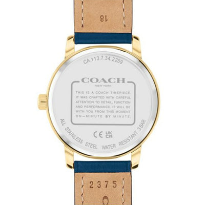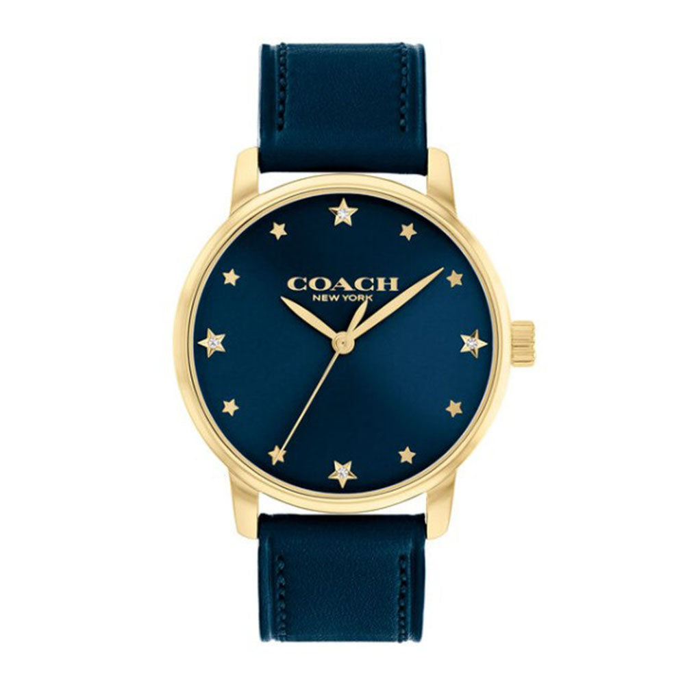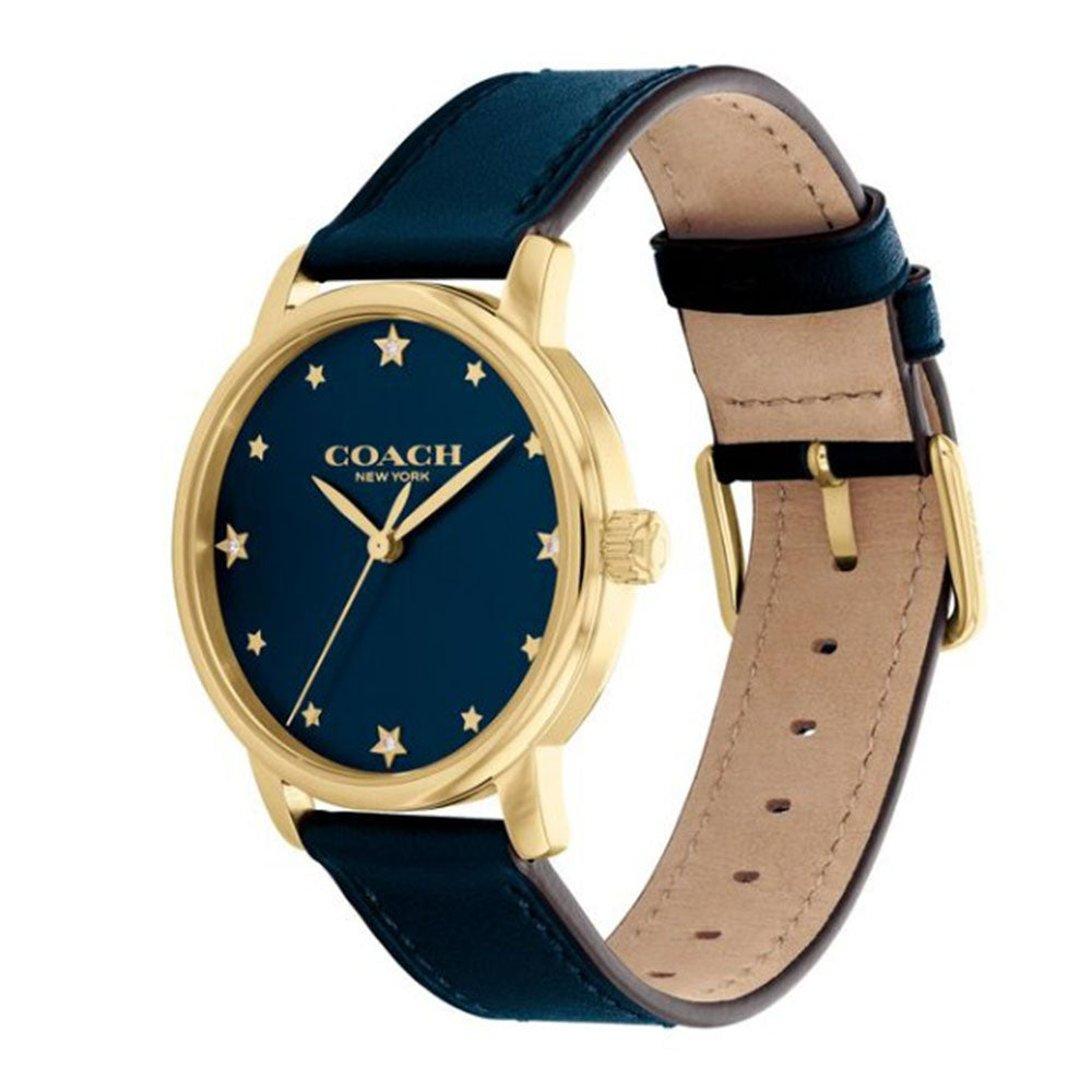 Grand, the pinnacle of understated elegance, is a timepiece that can be worn everywhere. A women's gold stainless steal case watch with navy dial and navy leather strap