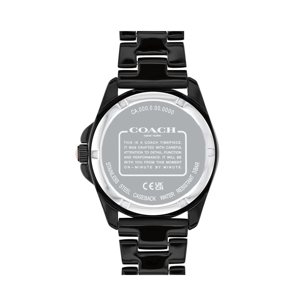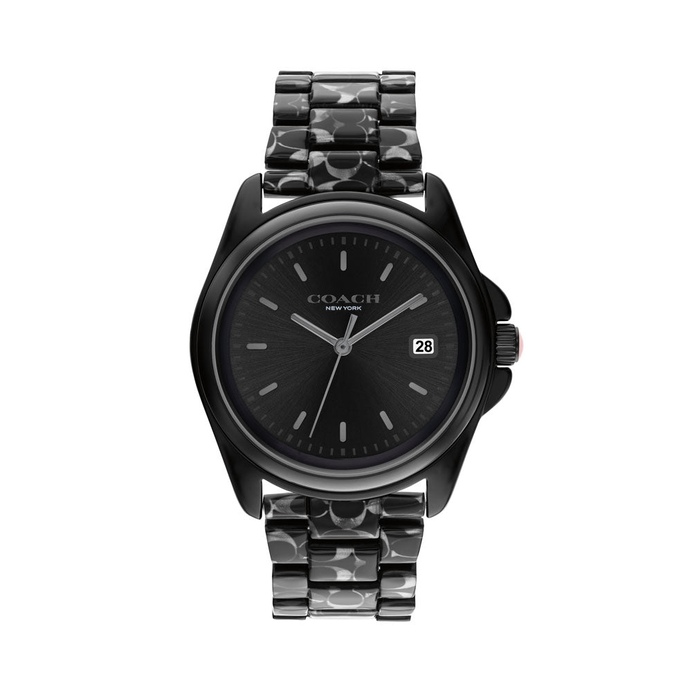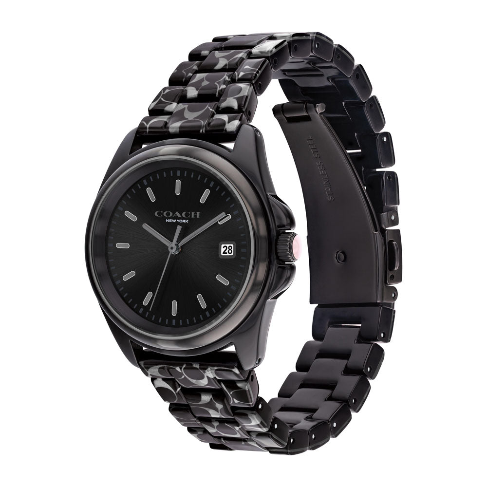 The epitome of refined sophistication, Greyson is a polished, go-everywhere timepiece. Finished with a versatile, durable strap crafted of custom-designed acetate featuring the iconic Coach Signature, this black ionic plated design has a black sunray dial detailed with stick markers and a date window at 3 o?clock.