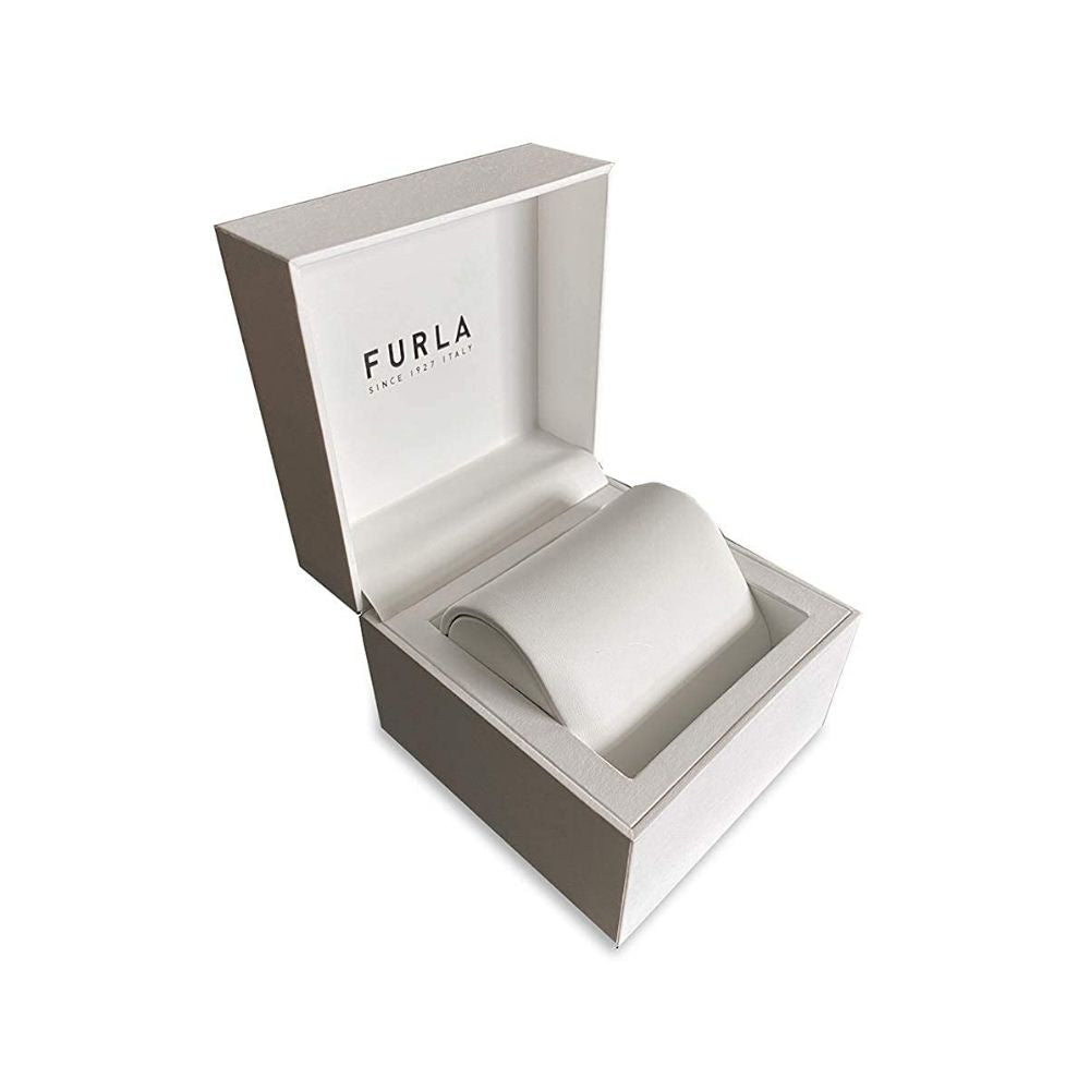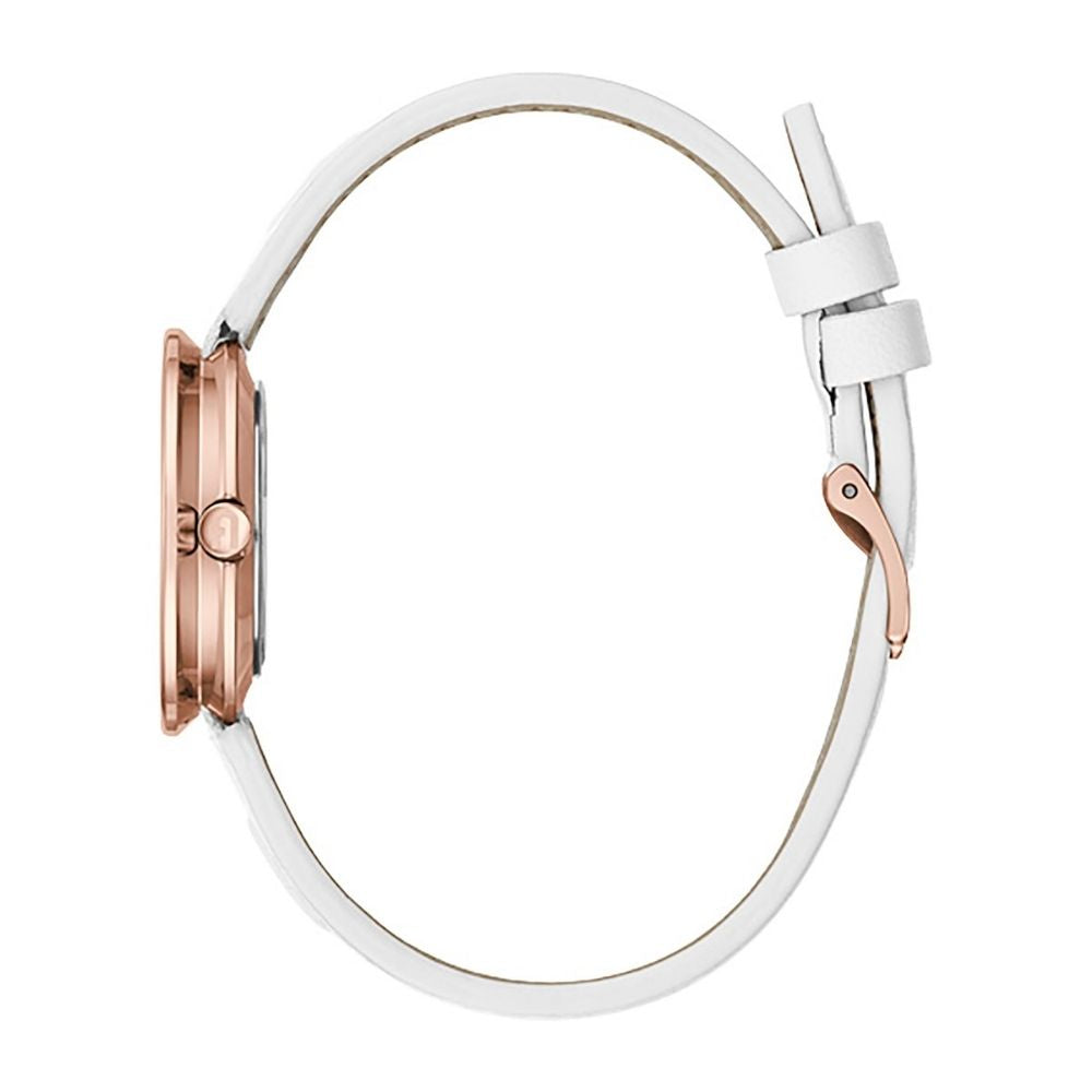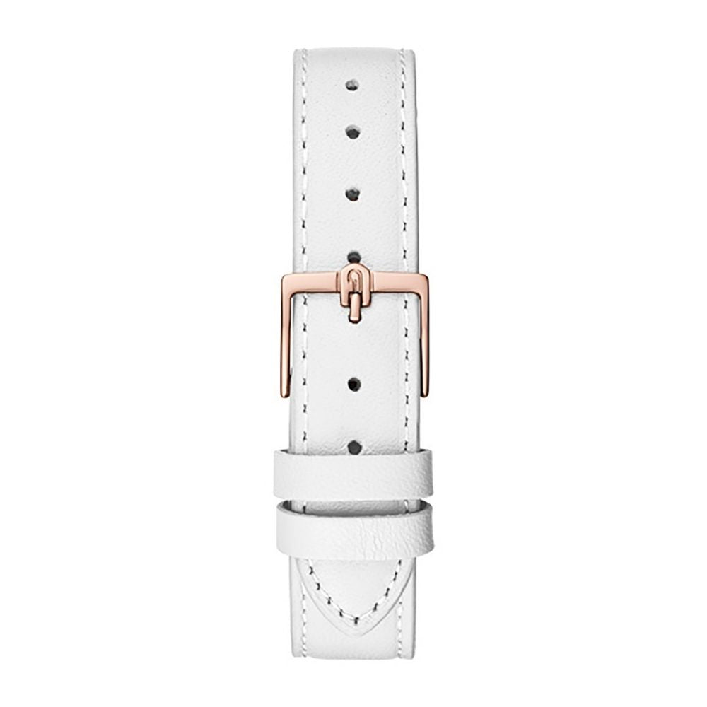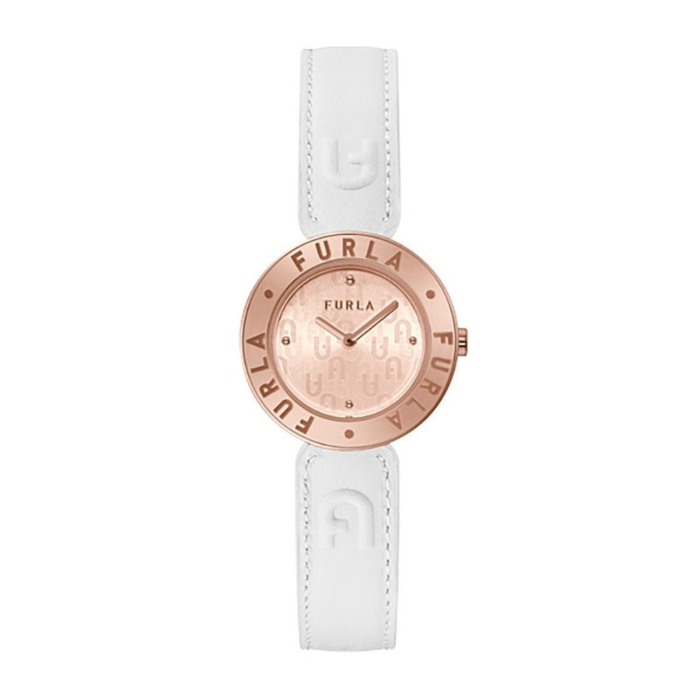 Iconically Furla with the block letter logo etched onto the top ring, this rose gold tone ladies timepiece is strikingly glamorous with its rose gold logo-patterned dial and logo-embossed white leather strap.