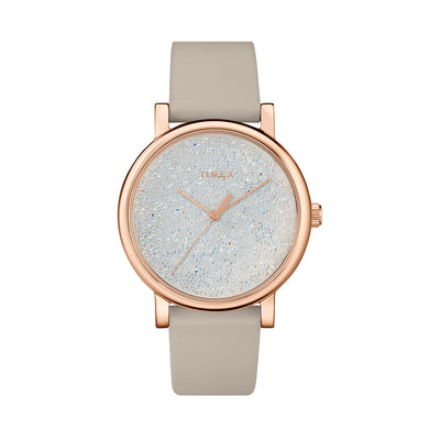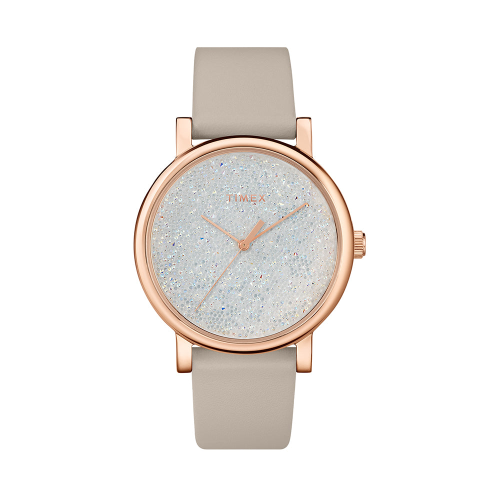 This Crystal Opulence watch does more than just tell time — it makes a bold yet feminine statement. Featuring a rose gold-tone case and gray leather strap, this watch is perfectly complemented by the white dial with crystal fabric made of tiny cut premium Swarovski® crystals for a brilliant shine.