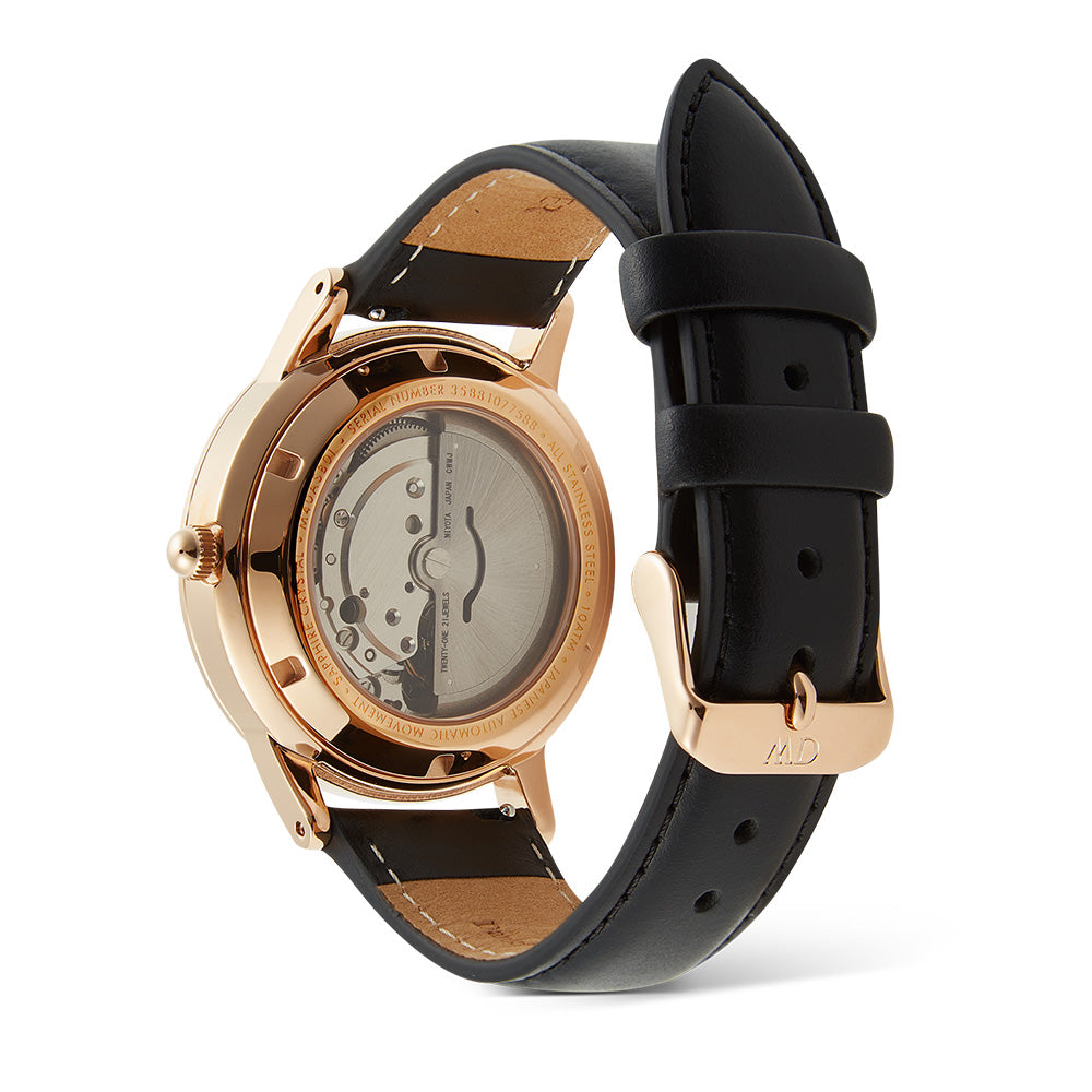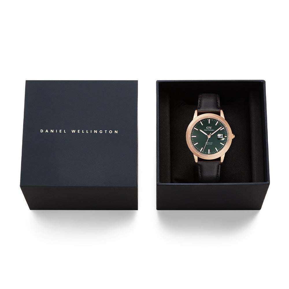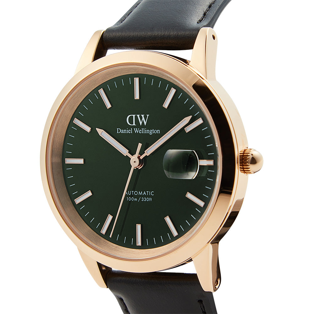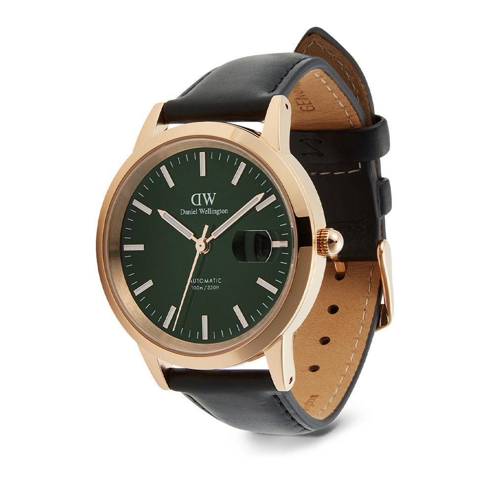 The Iconic Link Automatic is our most advanced timepiece to date, featuring a self-winding movement powered by the motion of your wrist. This version’s emerald green dial has an exclusive enamel finish, delivering a glossy and vivid hue. It boasts glow-in-the-dark index markers and floating hands, a magnified date display, and water-resistance up to 100 meters. The quick release spring bars on the black leather strap make for easy style changes, and there is scratch-resistent sapphire crystal covering the front and back of the rose gold watch. The exhibition case back exposes the automatic movement inside. A watch designed to get you where you need to be.