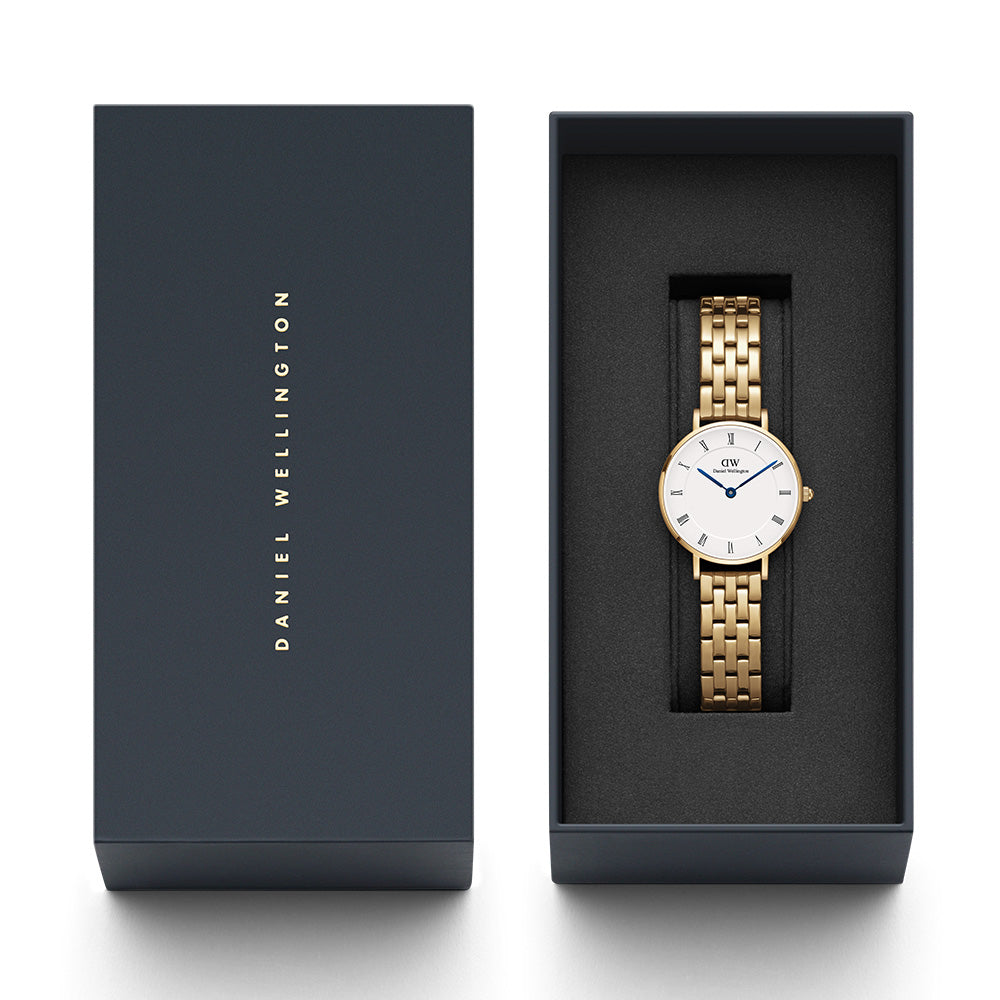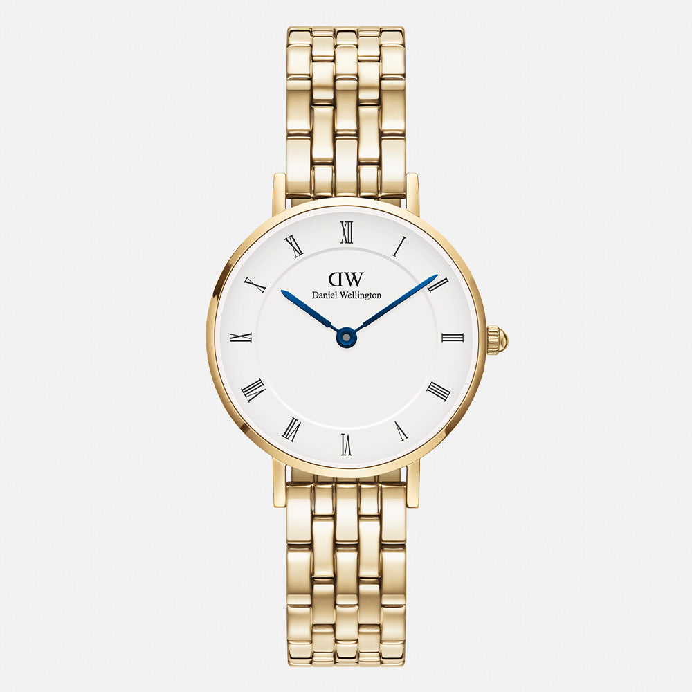 With vintage-inspired design details—like the Roman numeral dial and blue steel hands—this version of our Petite watch strikes just the right balance between old-school and trending now. Features an interchangeable 5-link strap in gold.