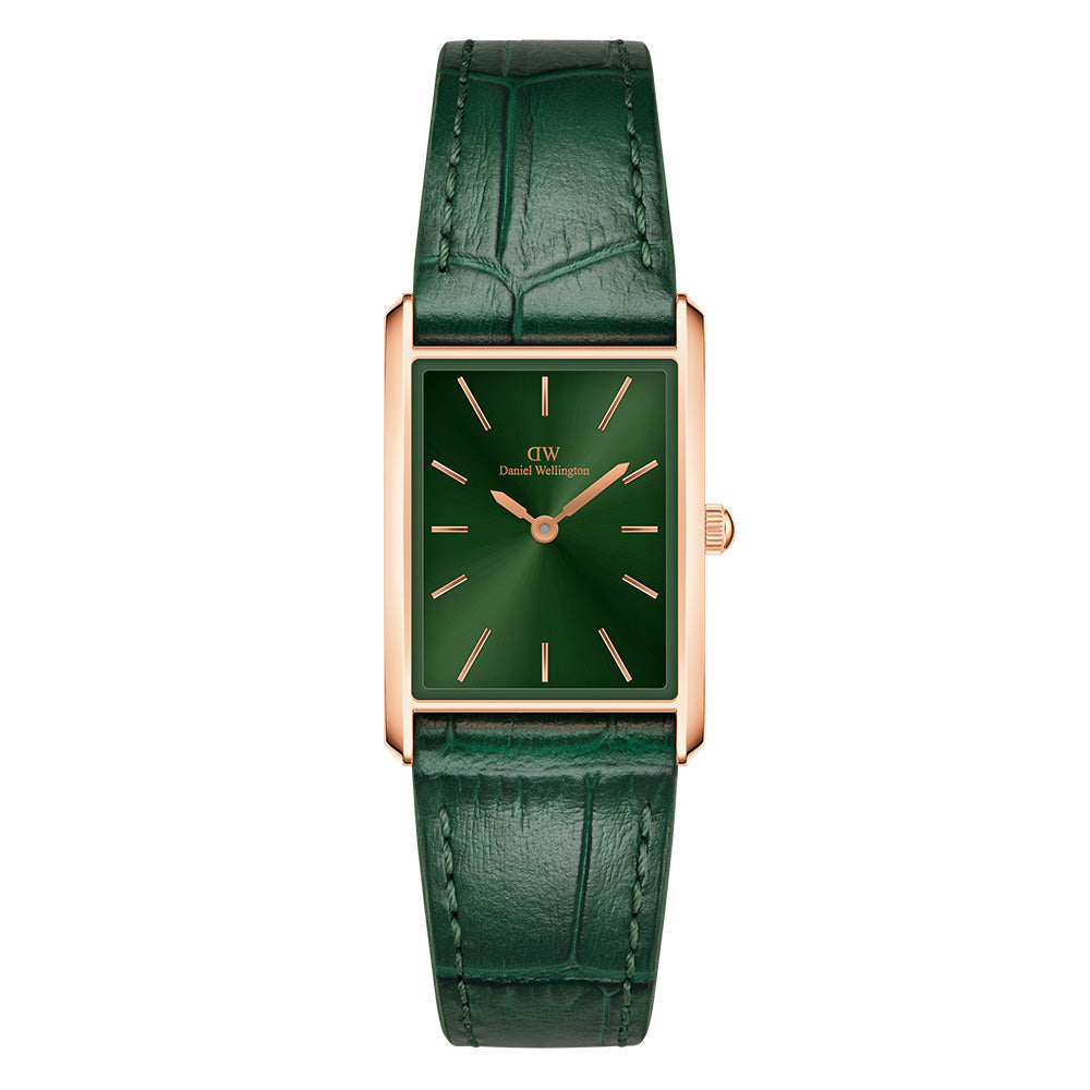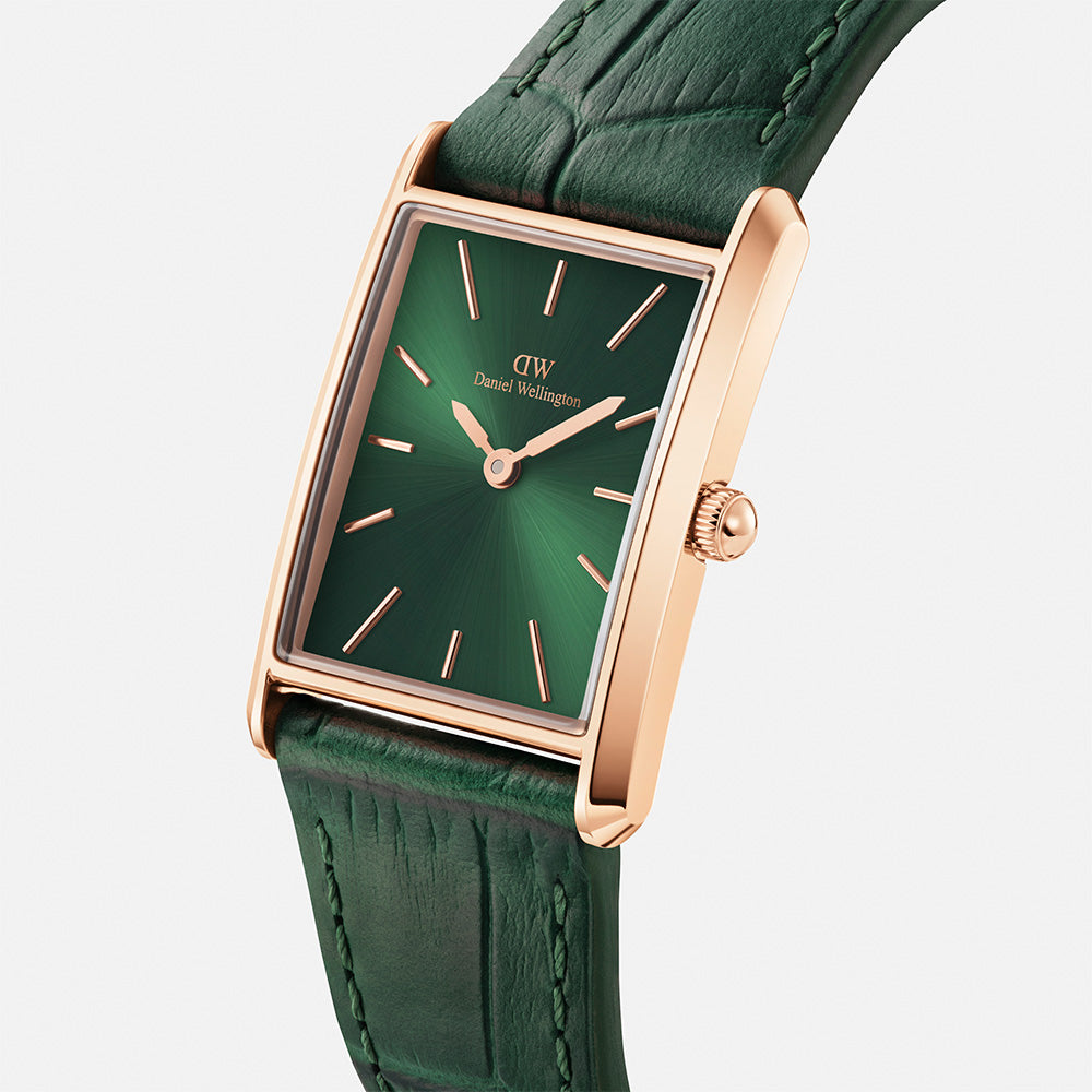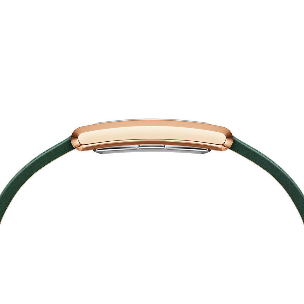 With sleek geometric edges and two sizes to choose from, our Bound collection brings perfect symmetry to your wrist. The curved rectangular case of this rose gold watch matches the exact width of its crocodile pattern emerald leather strap—giving you a seamlessly integrated sunray dial.