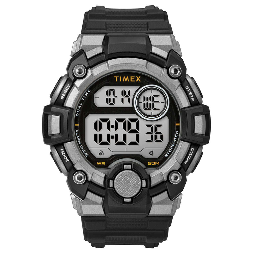 This oversized digital watch is a tactical timepiece, built with innovative digital technology and legendary durability to make meeting the demands of everyday life look easy. The metallic grey resin case and black strap are sealed for water resistance up to 50 meters, and with our INDIGLO® backlight, you are good to go all night.