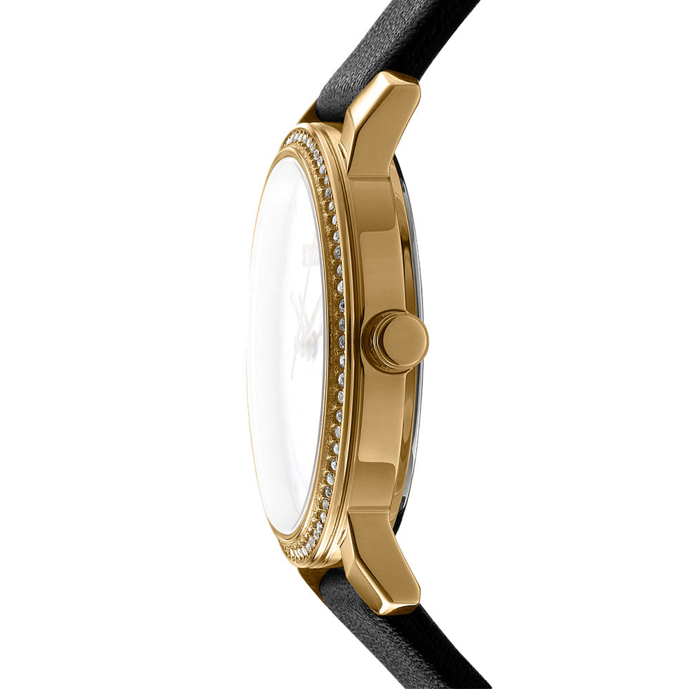 Classic elegance meets modern city style. Featuring a refined gold-tone case with a crystal-studded bezel, a crisp white dial, and sleek minimalist markers, this watch exudes sophistication. The warm brown leather strap adds a touch of effortless charm, making it the perfect blend of luxury and everyday wearability.