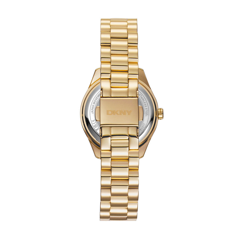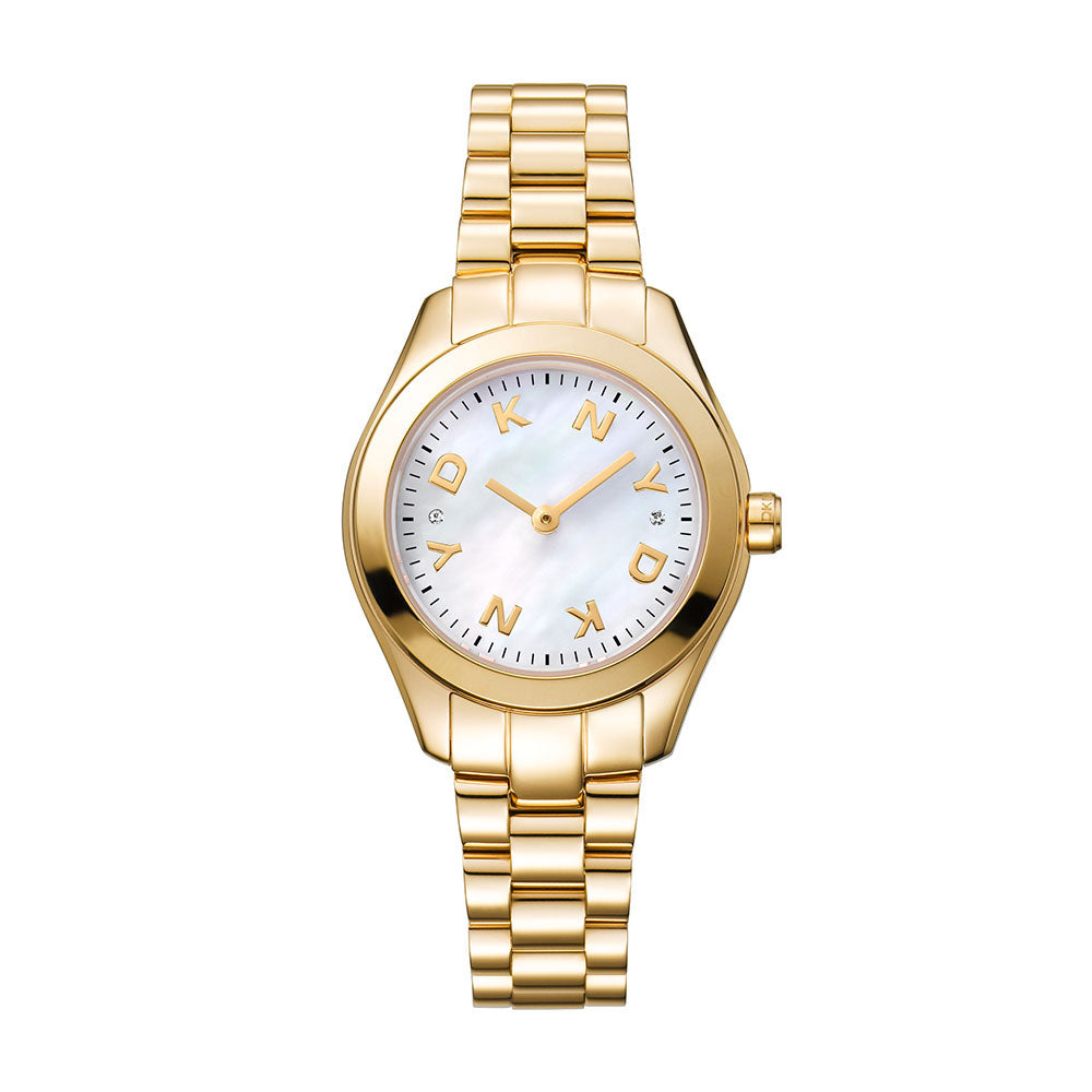A stunning fusion of modern style and elegance, this gold-tone watch is a statement of luxury. The lustrous mother-of-pearl dial, accented with diamond markers and bold DKNY lettering, captures the essence of sophistication with a contemporary twist. A timepiece for those who shine with confidence and embrace the art of living boldly.