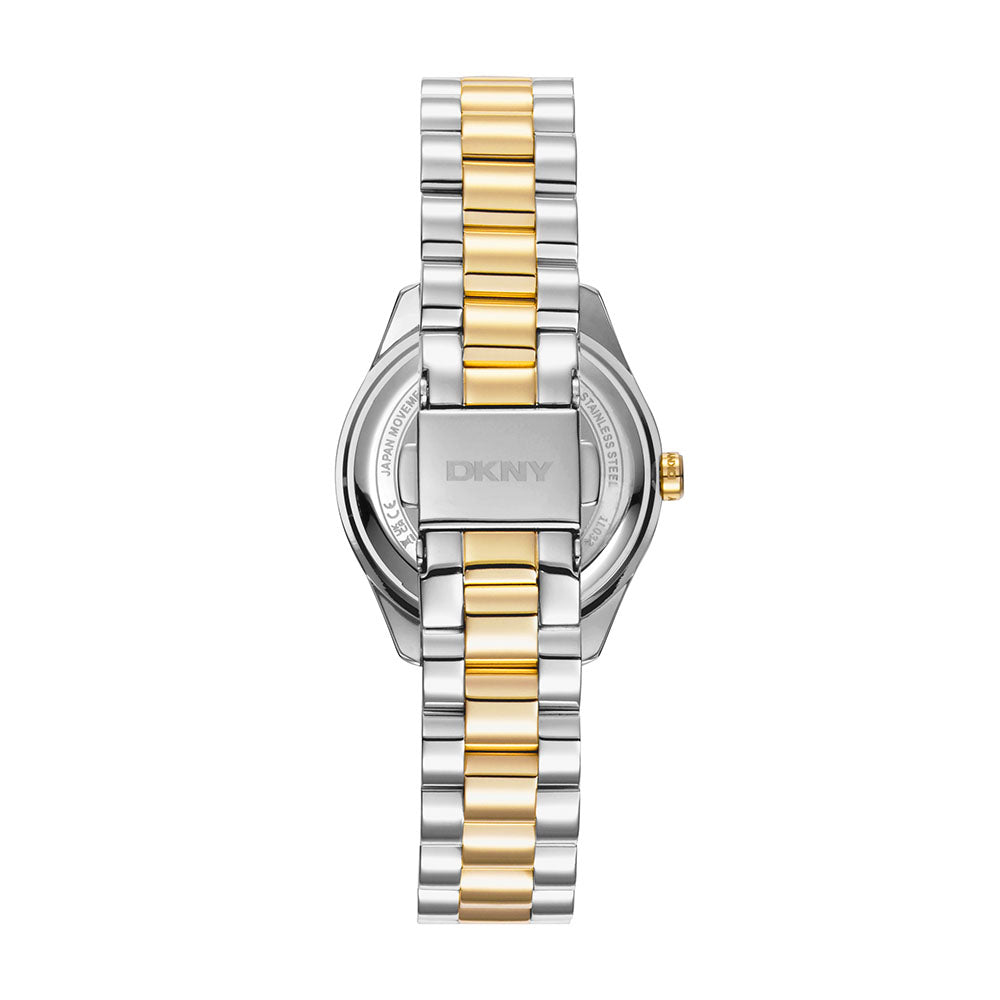 A true standout. Featuring a radiant green dial and complemented by a polished gold and silver-tone bracelet, the design is effortlessly chic. With diamond markers and the signature DKNY touch, this timepiece is perfect for those who make a statement with sophistication and style.