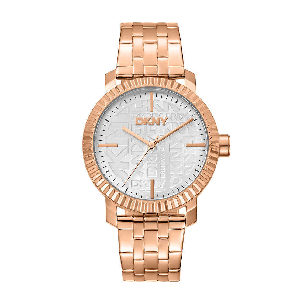 Featuring a 36mm round stainless steel case, this timepiece stands out with its sleek silver-tone dial, where the DKNY logo is intricately printed in varying shapes for a contemporary, dynamic feel. The gold-plated DKNY logo at 12 o'clock, embossed in relief, adds a refined and bold accent.