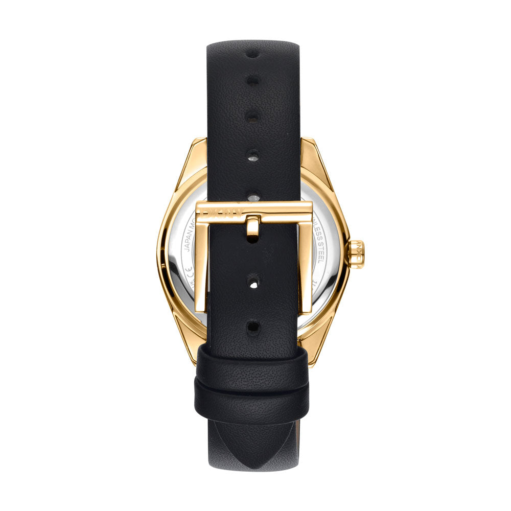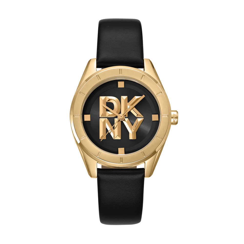 At the heart of the black dial, the large DKNY logo in gold relief creates a striking focal point, perfectly balancing the clean, minimalist design. The subtle incision on the bezel adds an element of dynamism, while maintaining an air of sophistication and equilibrium.