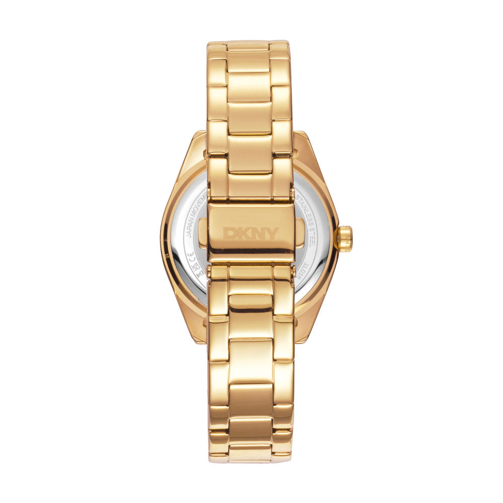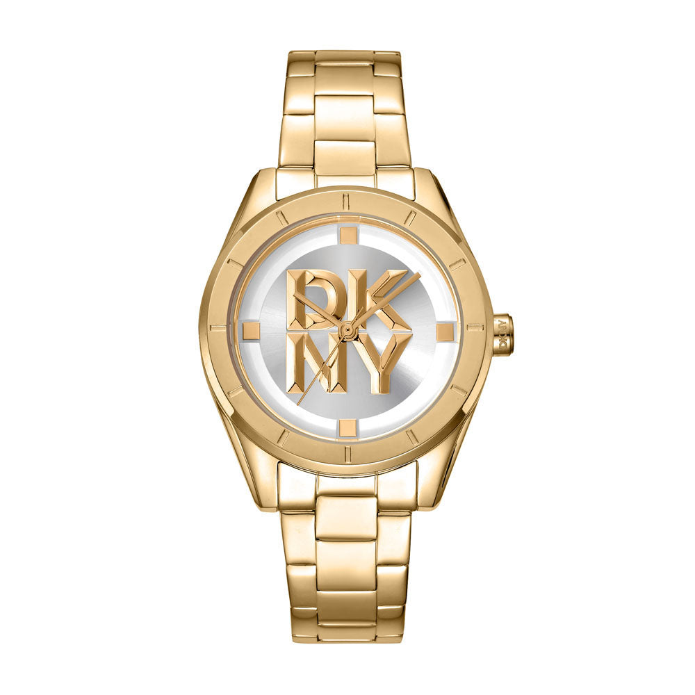 At the heart of the silver dial, the large DKNY logo in gold relief creates a striking focal point, perfectly balancing the clean, minimalist design. The subtle incision on the bezel adds an element of dynamism, while maintaining an air of sophistication and equilibrium.