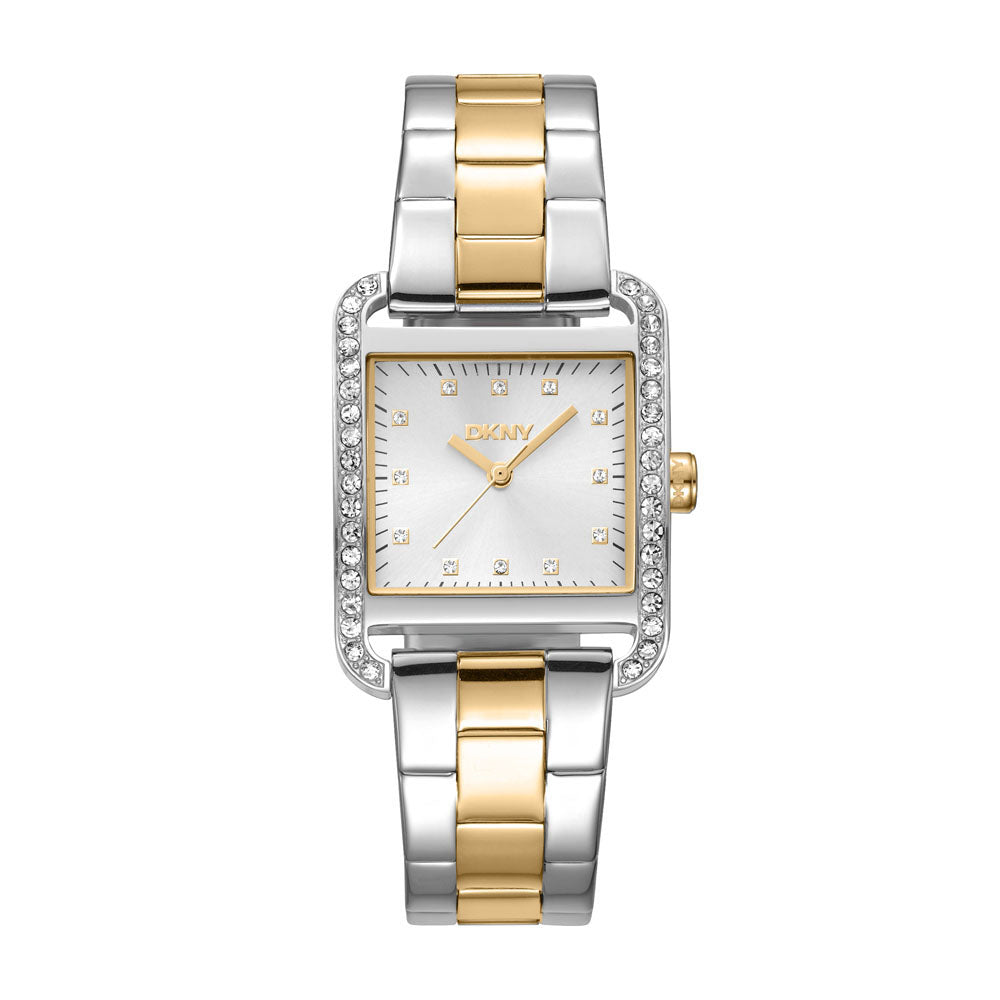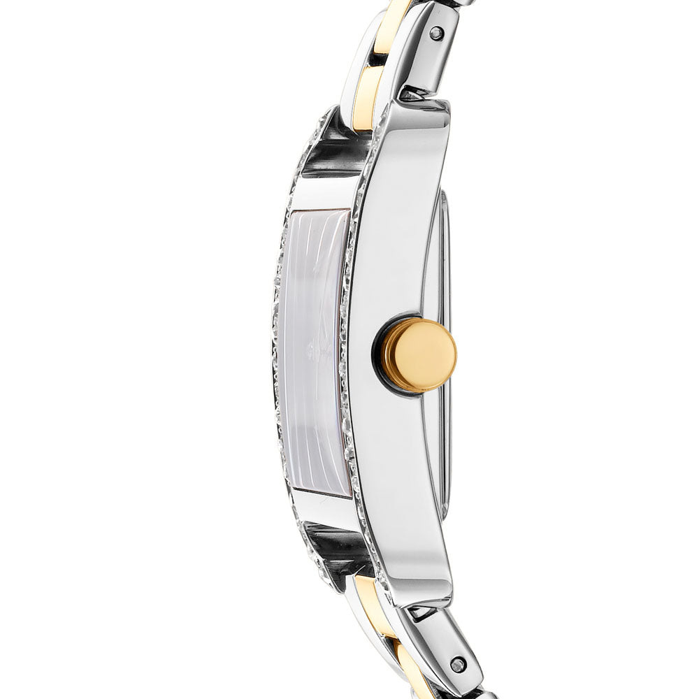 A watch that blends classic sophistication with modern allure. Its silver and gold-tone bracelet exudes versatility, while the crystal-adorned bezel adds a touch of brilliance. Paired with a sleek silver dial and gold accents, this timepiece is the perfect statement of refined glamour.