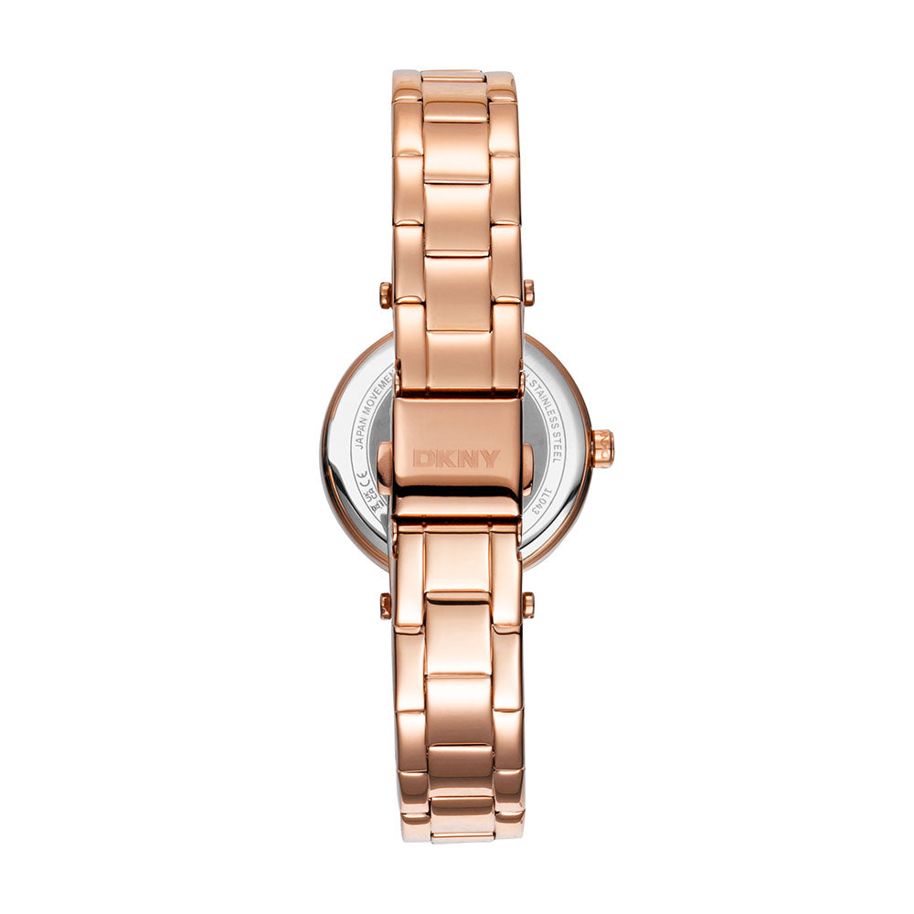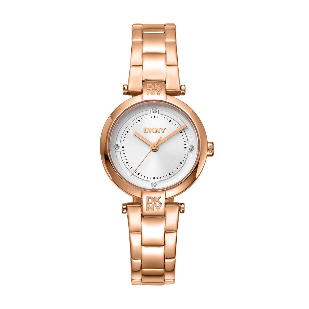 A watch that brings delicate sophistication to every moment. This refined timepiece features a 28mm round case with a unique T-bar structure, elegantly highlighted by the iconic DKNY logo at the junction, adding a touch of signature style.