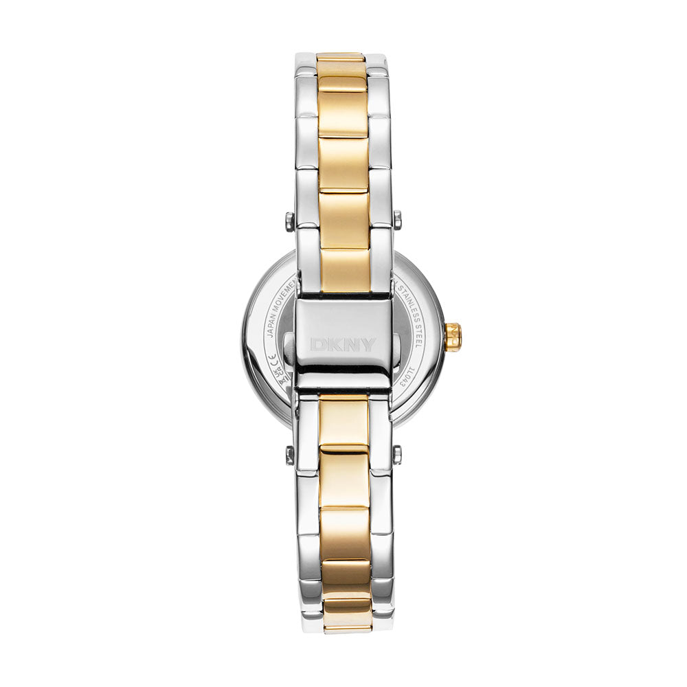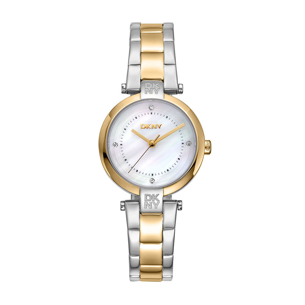 A watch that brings delicate sophistication to every moment. This refined timepiece features a 28mm round case with a unique T-bar structure, elegantly highlighted by the iconic DKNY logo at the junction, adding a touch of signature style.