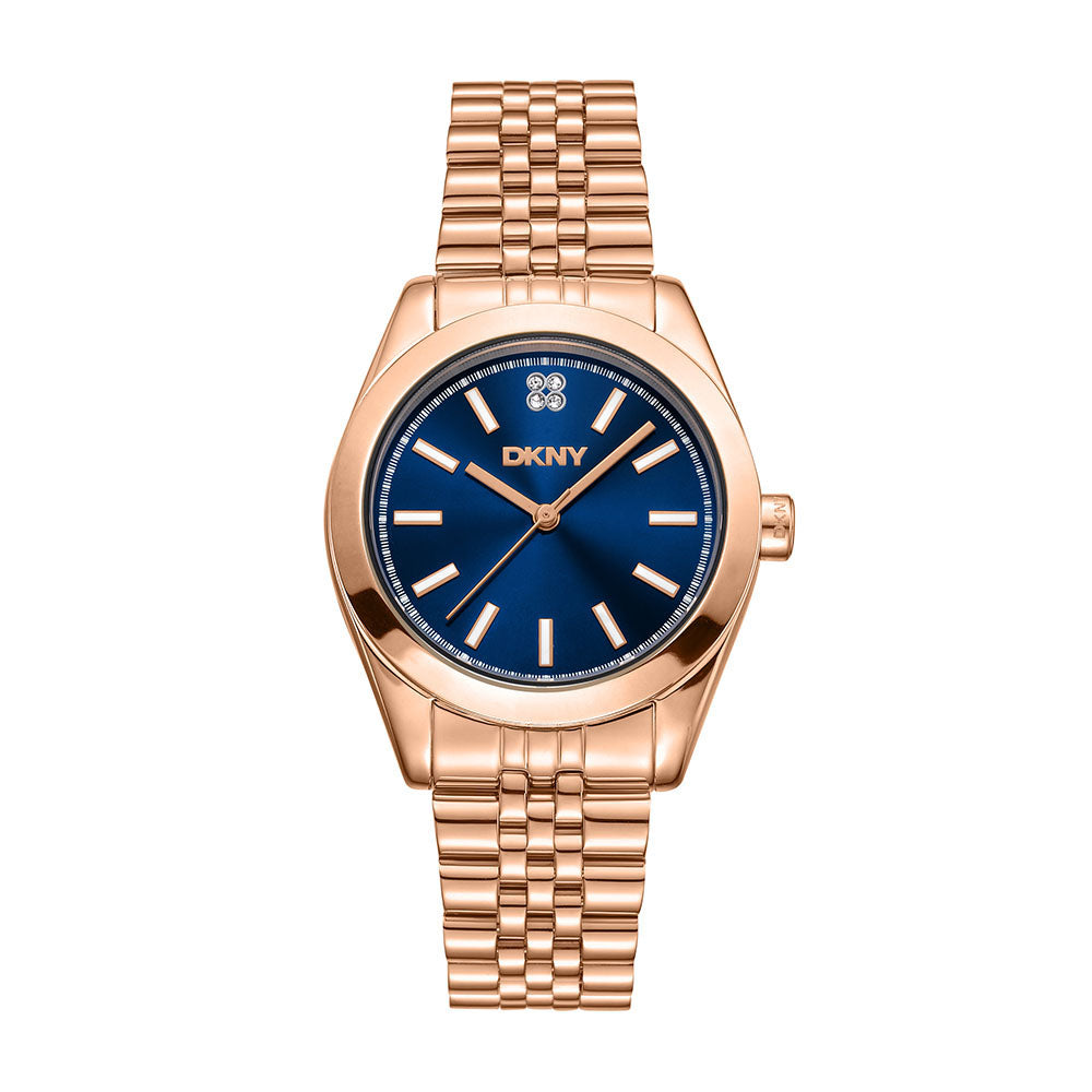 The open dial offers a clear, legible display, while four sparkling stones at the 12 o'clock position add a touch of refinement.