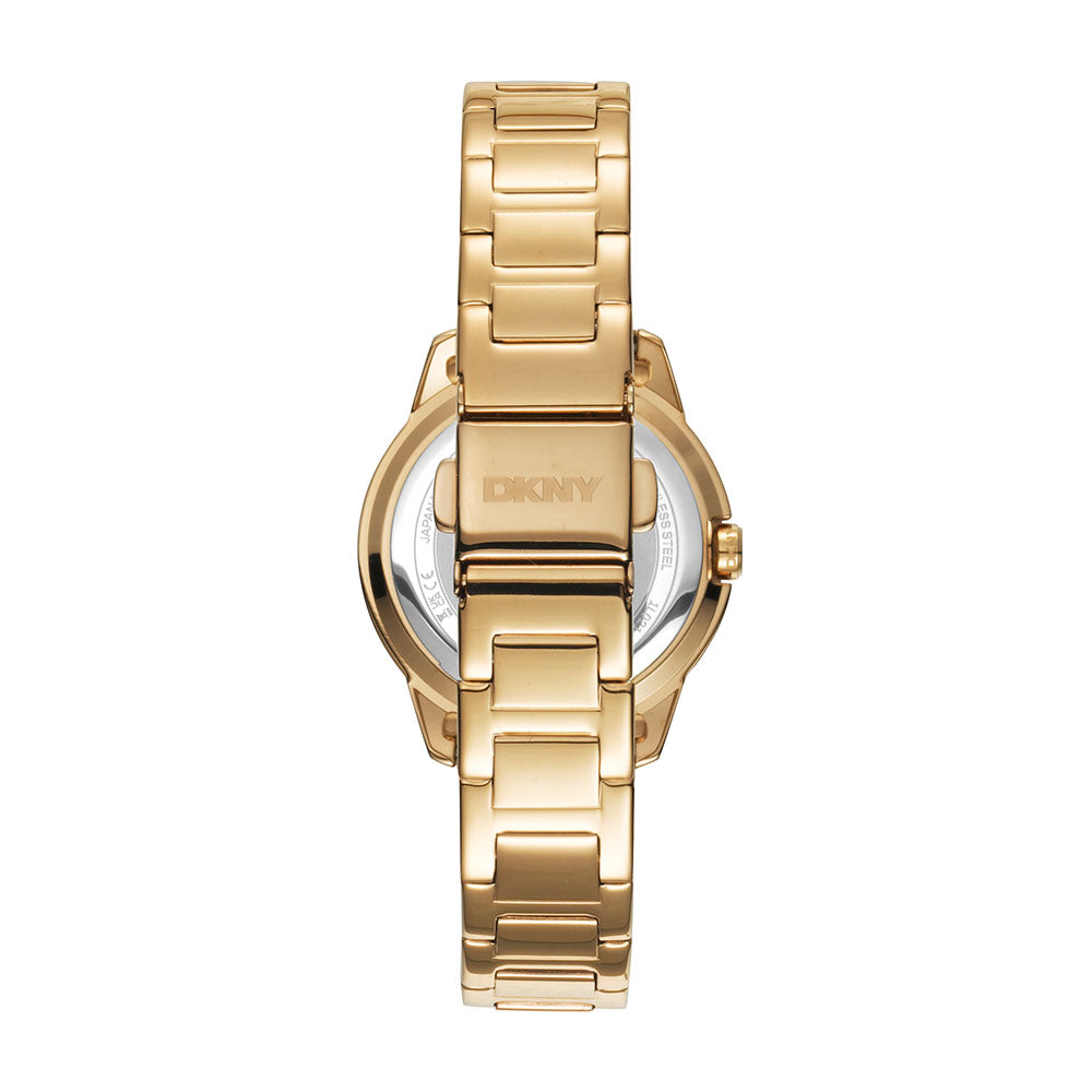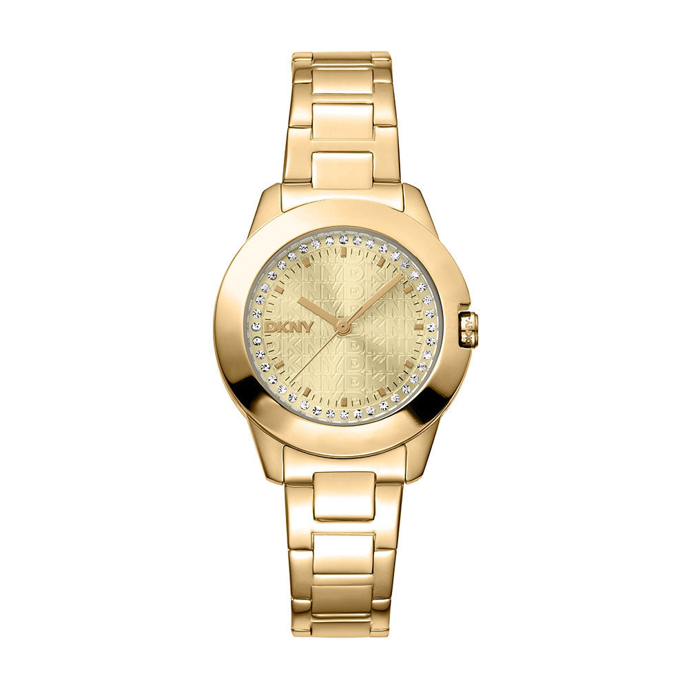 Its 30mm round case features a clean, minimal bezel that contrasts beautifully with the detailed dial, which is adorned with stones around the edge and a tonal DKNY logo repeated across the surface. The addition of the signature yellow gold-plated logo at 9 o'clock adds a sophisticated touch.