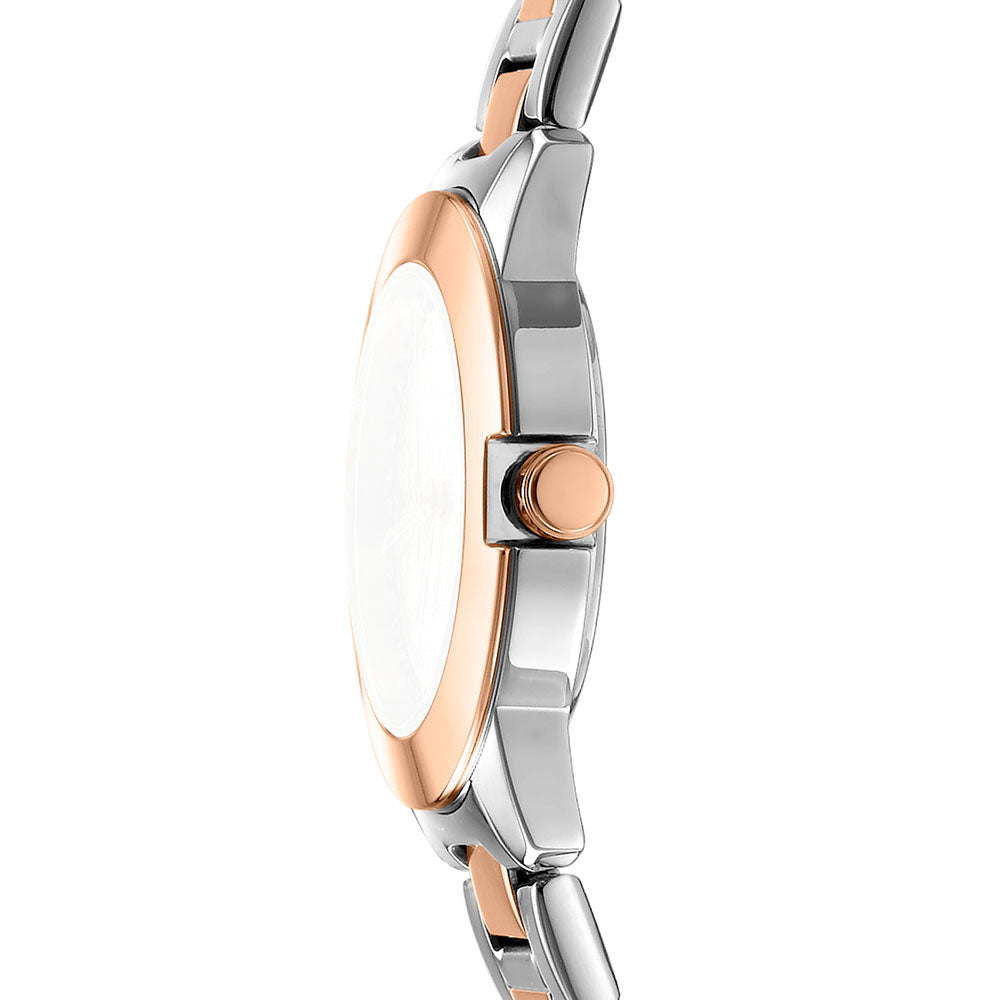Its 30mm round case features a clean, minimal bezel that contrasts beautifully with the detailed dial, which is adorned with stones around the edge and a tonal DKNY logo repeated across the surface.