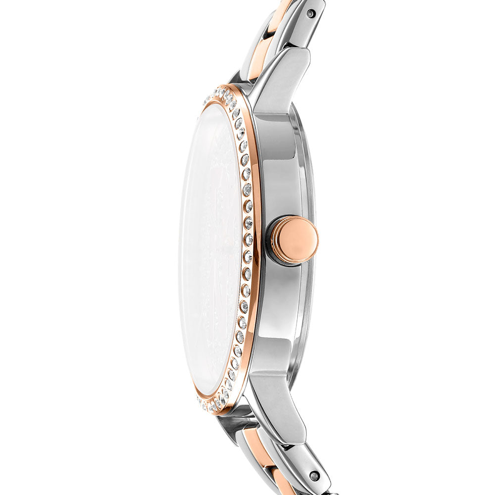 At the heart of the dial, the large DKNY logo is gracefully set against a sparkling pavé of stones, adding a touch of shimmer to its minimalist design. The stones continue around the bezel, amplifying the watch's eye-catching appeal while maintaining a refined elegance.