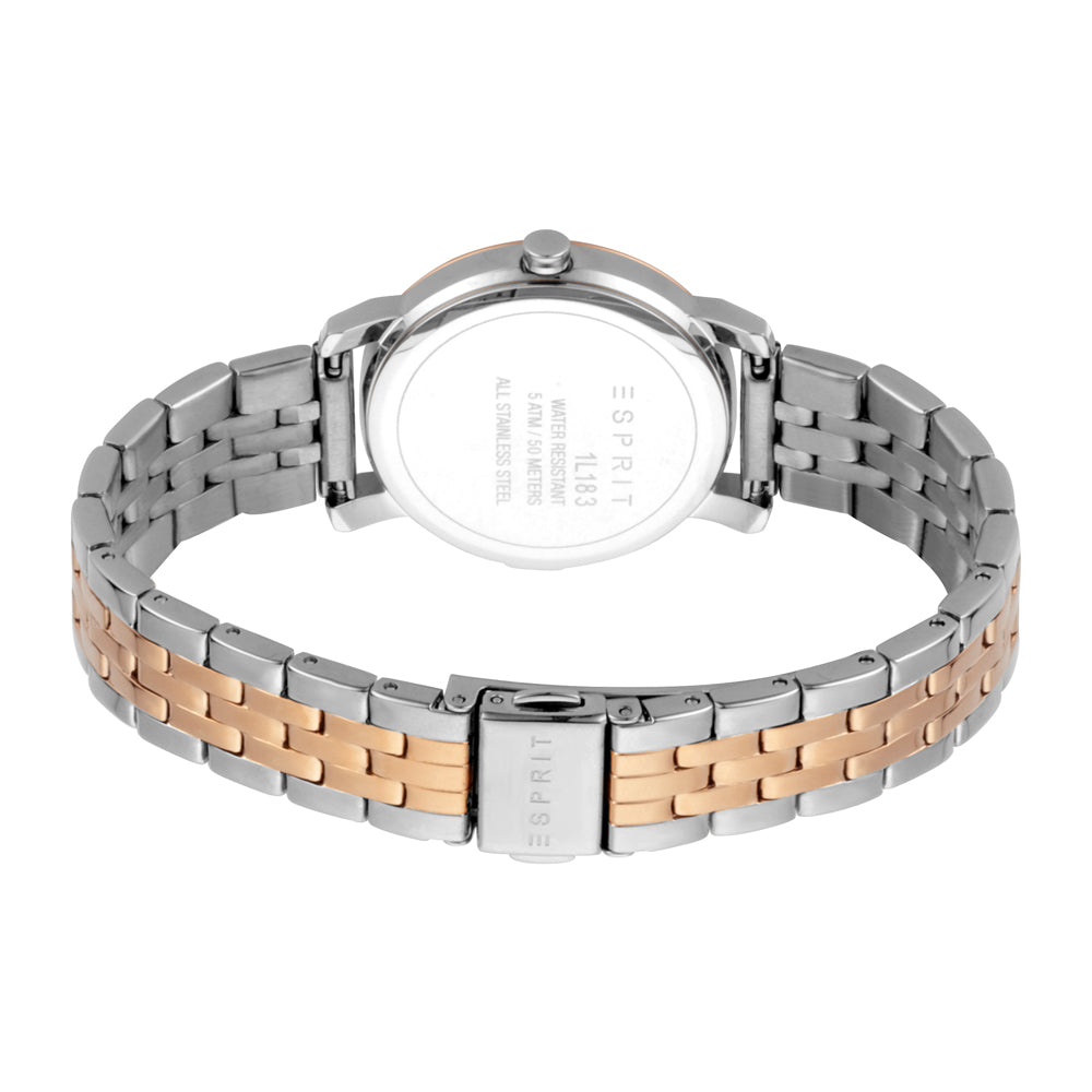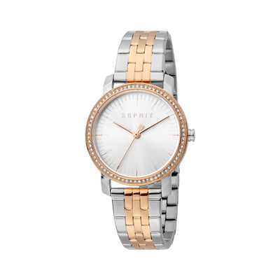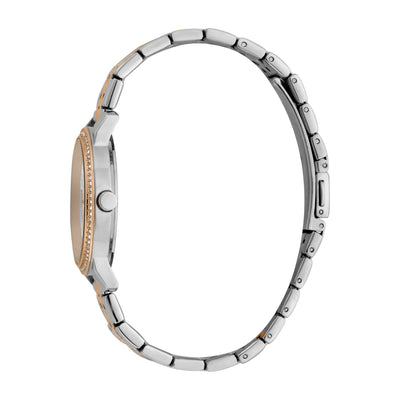 A bezel trimmed with sparkling zirconia stones gives this two tone rosegold stainless steel watch an elegant and glamorous update