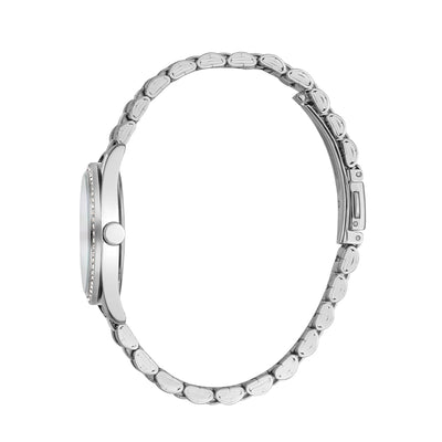 Silver has never gone out of style. This contemporary timepiece combines date functionality with precious stones markers and mother of pearl dial. Simple, clean but speaks elegance.