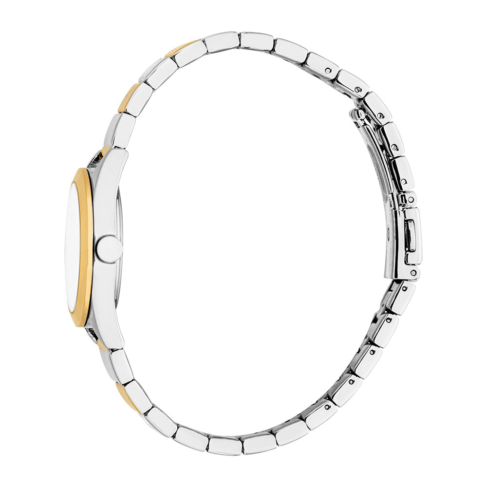 This sophisticated two-tone watch blends the richness of gold with the sleekness of silver, featuring a detailed white dial adorned with crystal markers. It’s the perfect accessory for those who appreciate a harmonious balance of classic and modern design.