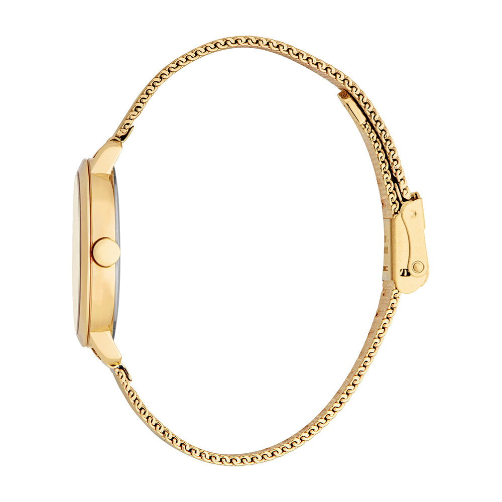Gold tone glamour. Combining an elegant all gold case and subtle zirconia trim with a comfort fitting adjustable stainless steel mesh bracelet